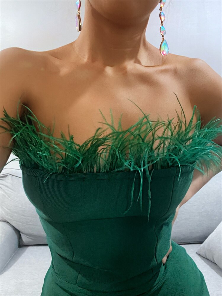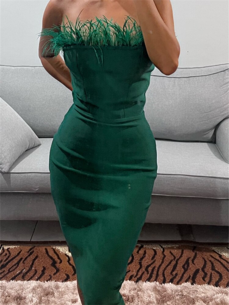 kamames Fur Feather Patchwork Sexy Women Knee Length Dress 2023 Strapless Off Shoulder Party Elegant OL Pencil Dress Vestidos
