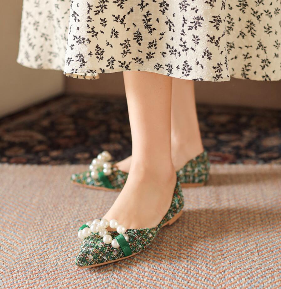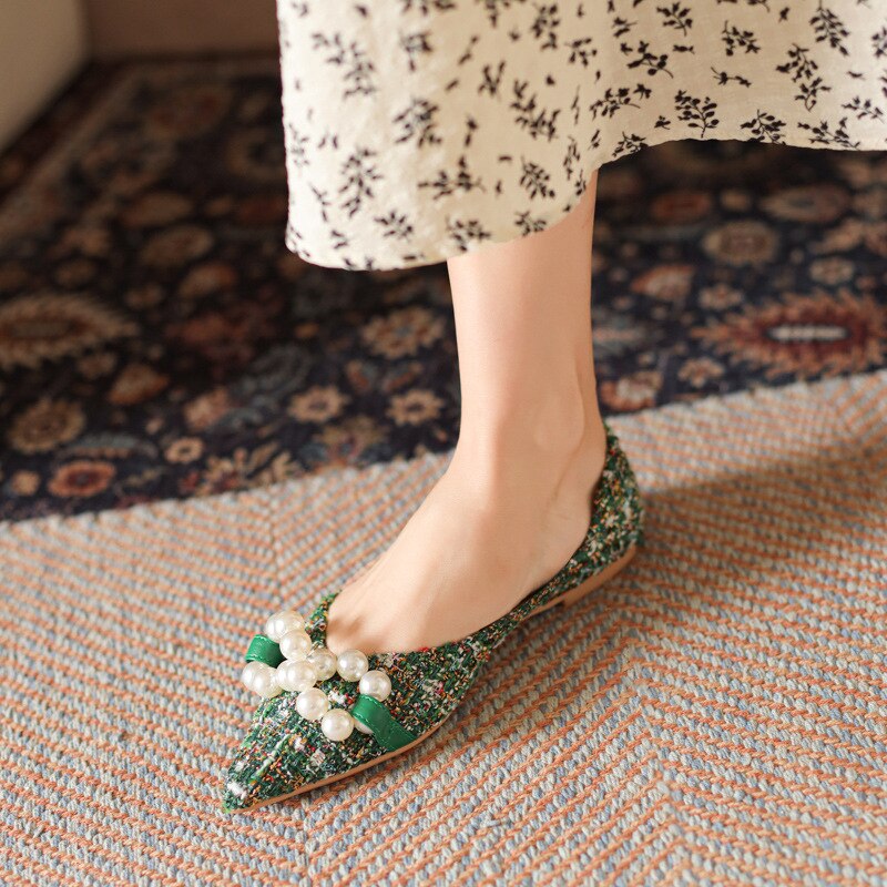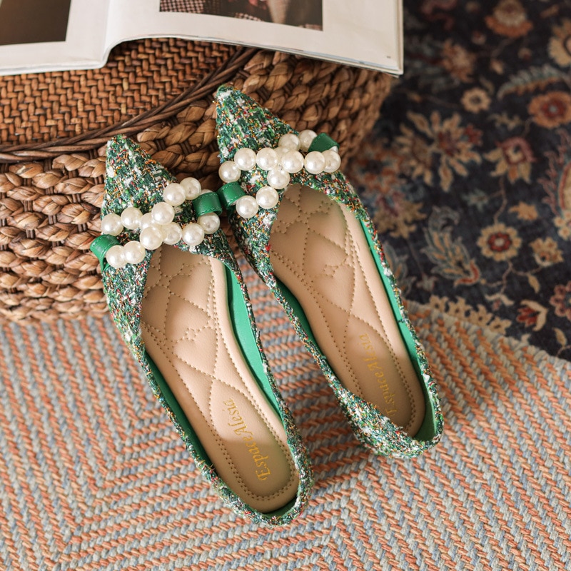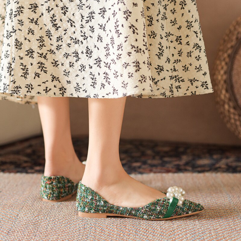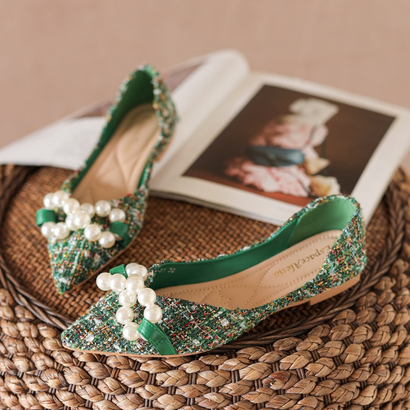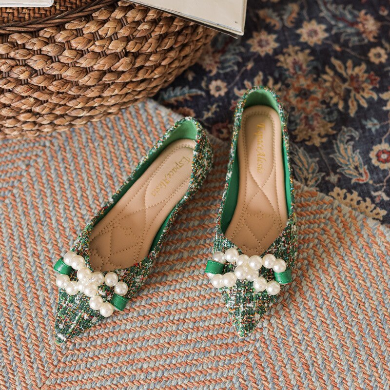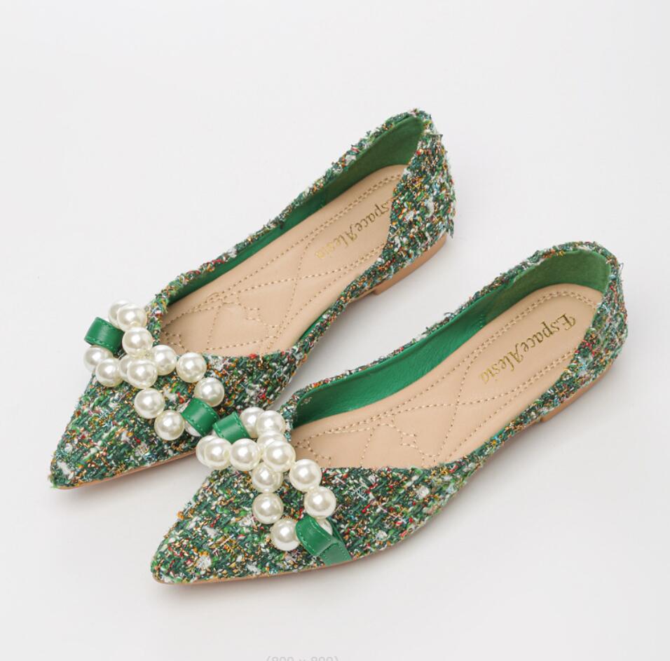 kamames Green Soft Pointed Toe Flat Shoes Women Ballet Shoes 2023 Spring New Pearl Bow Korean Ladies OL Office Shoes