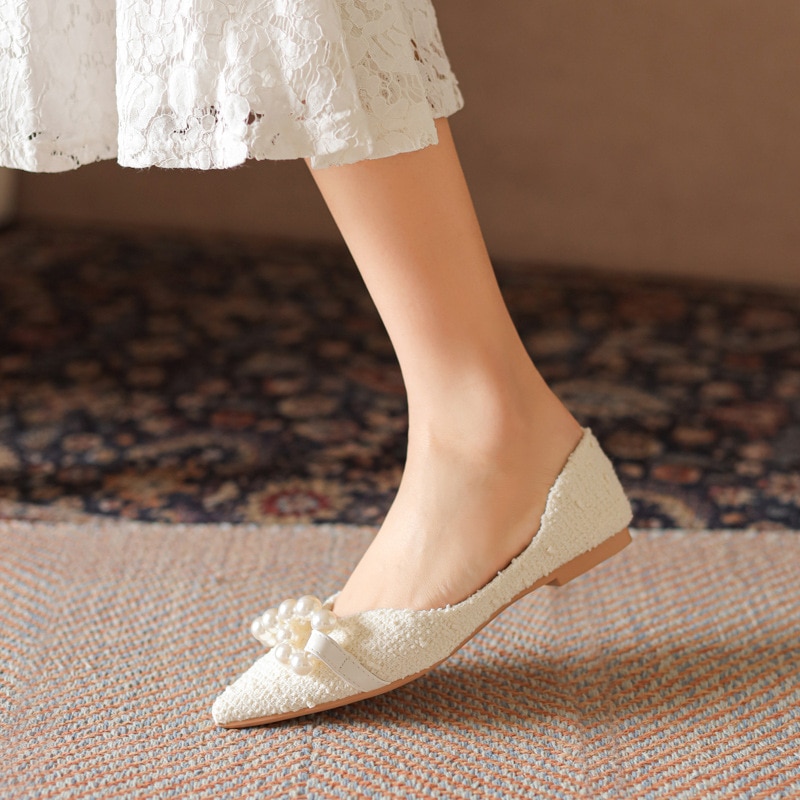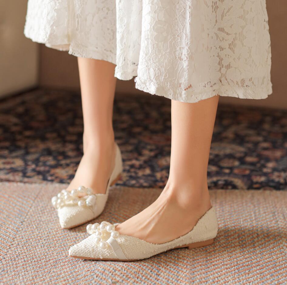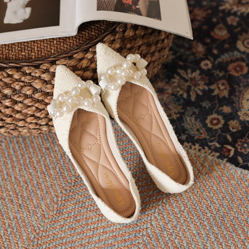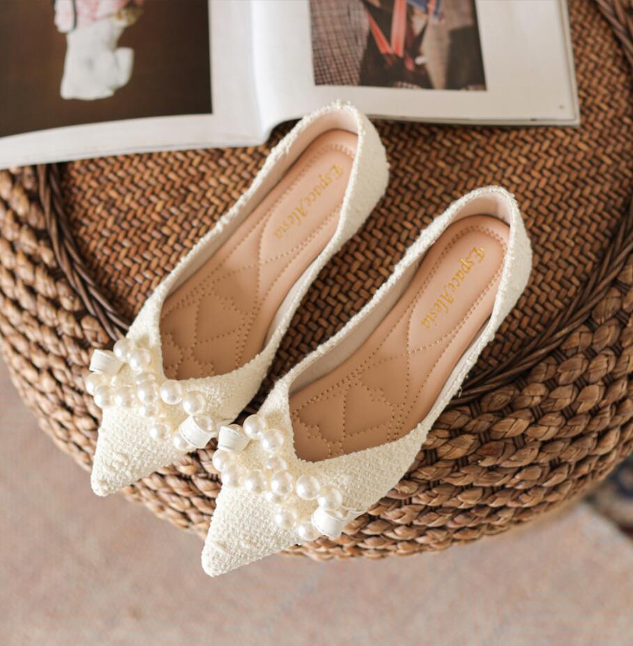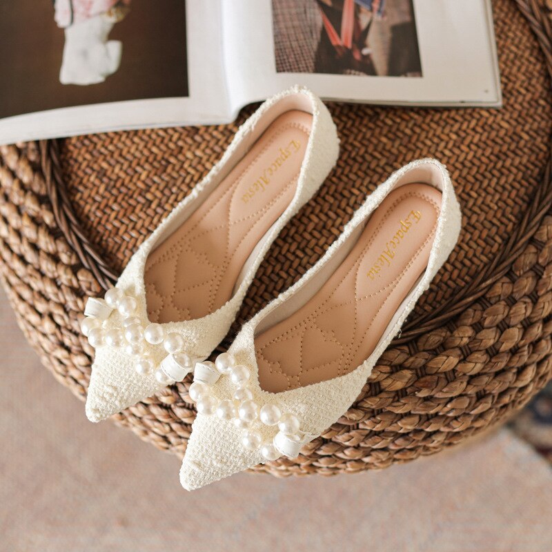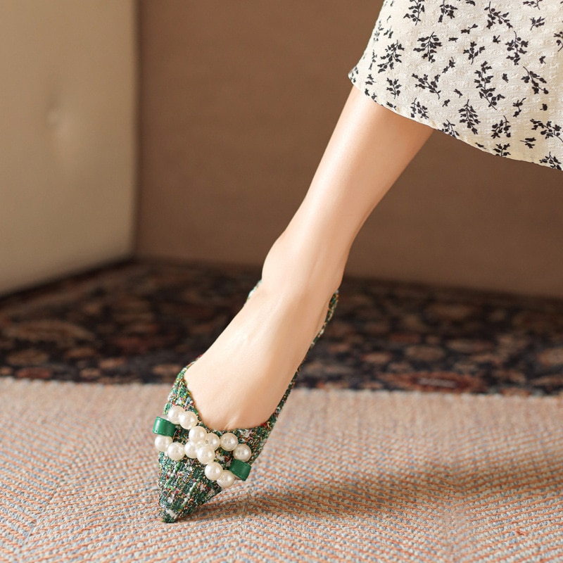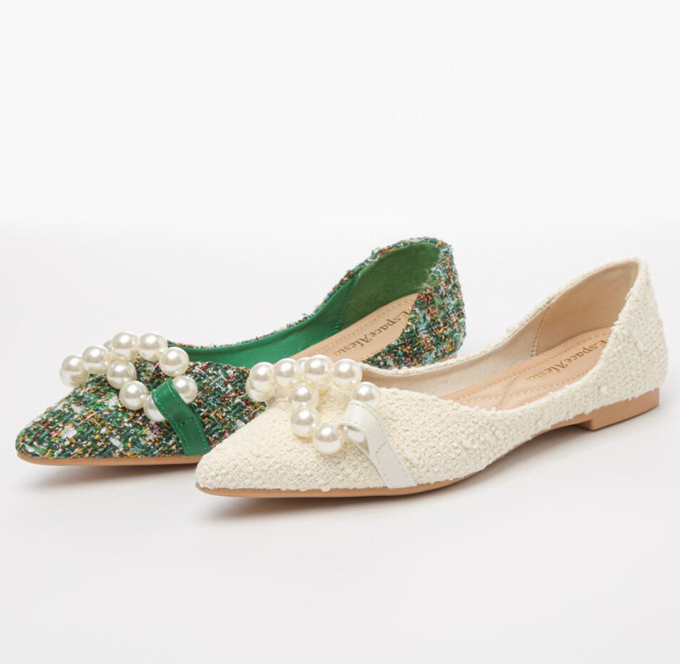 kamames Green Soft Pointed Toe Flat Shoes Women Ballet Shoes 2023 Spring New Pearl Bow Korean Ladies OL Office Shoes