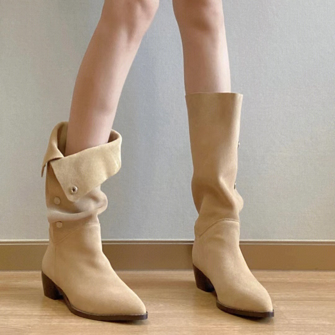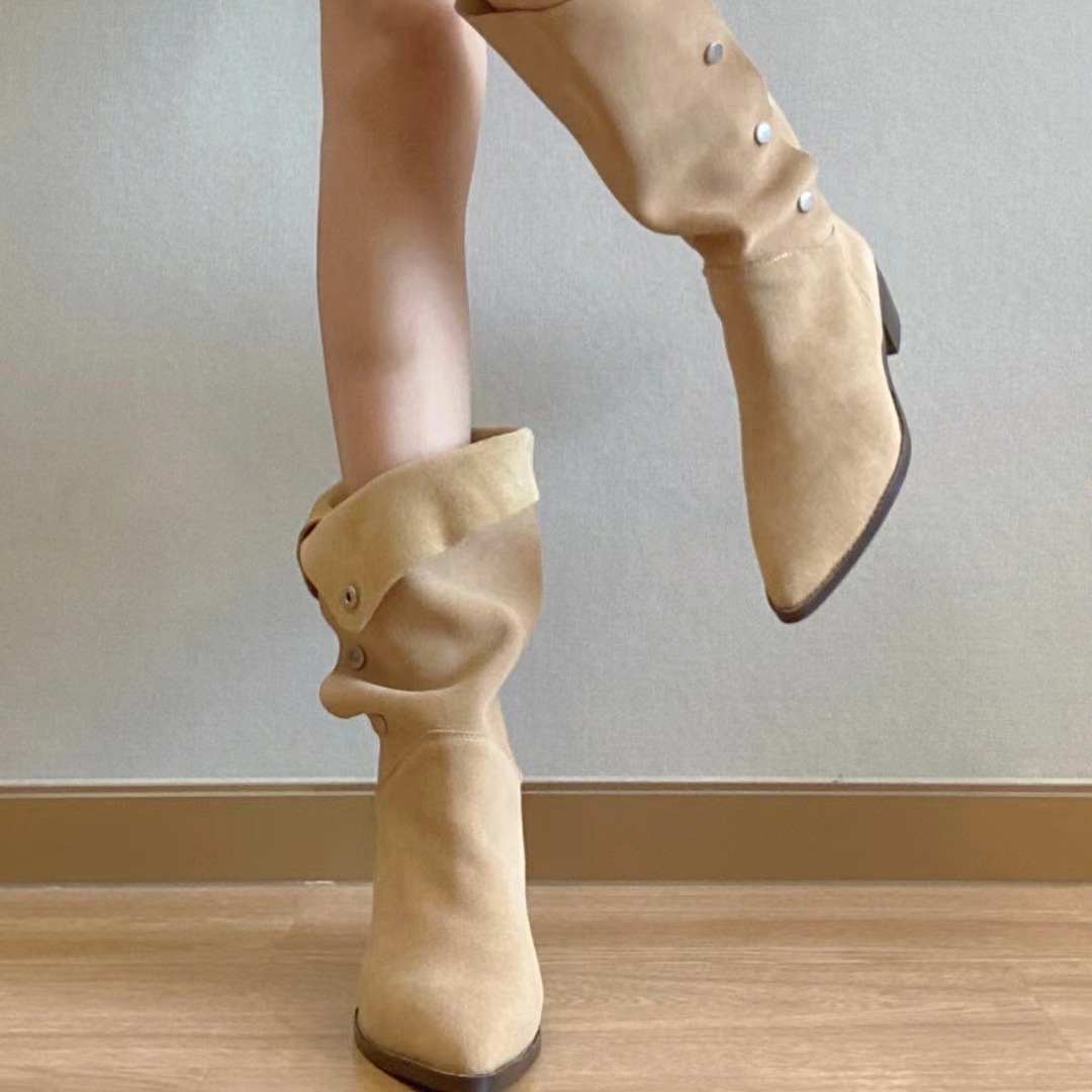 kamames kamames Shoe Two Wear Vintage Wrinkled Boots Frosted Pile Boots Female Thick Heel Temperament Pointed Button Middle Boots