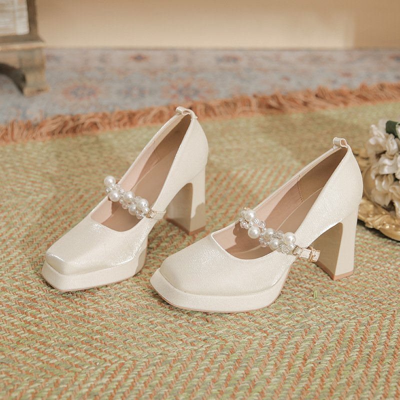 kamames kamames Square Head Thick Heel High Heels 2024 Spring French Pearl One Word Buckle Satin Wedding Shoes Bride Shoes