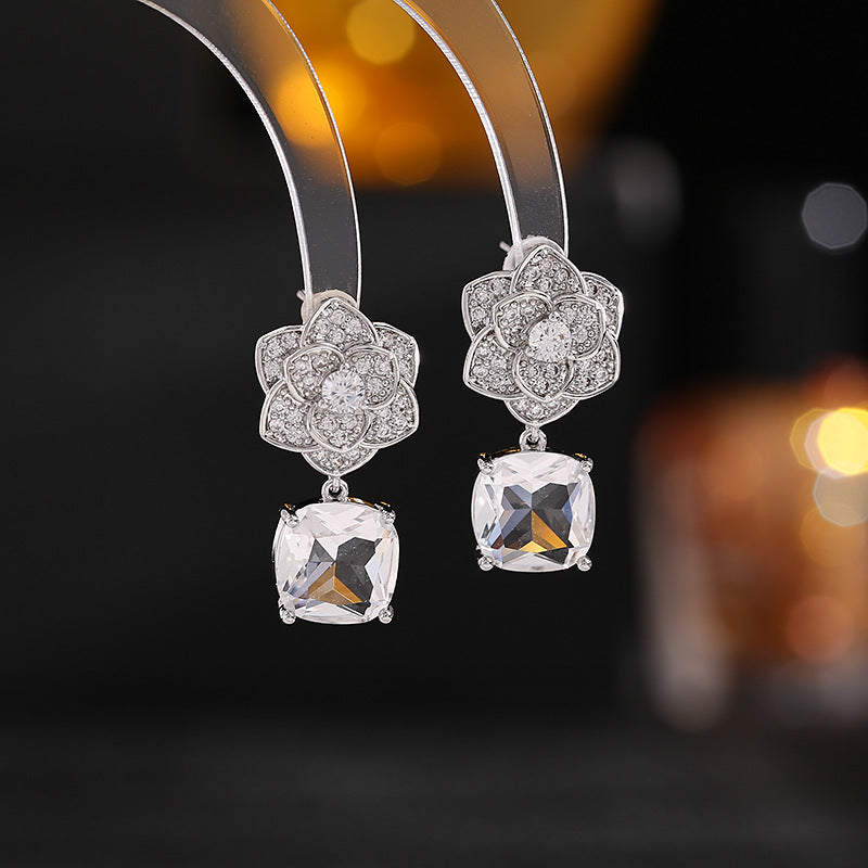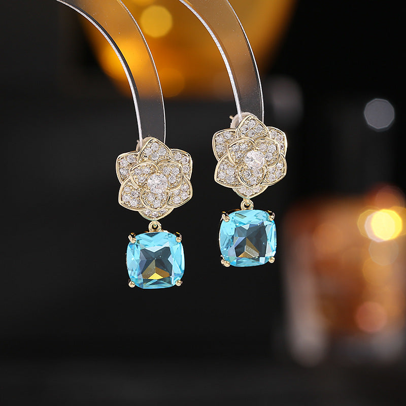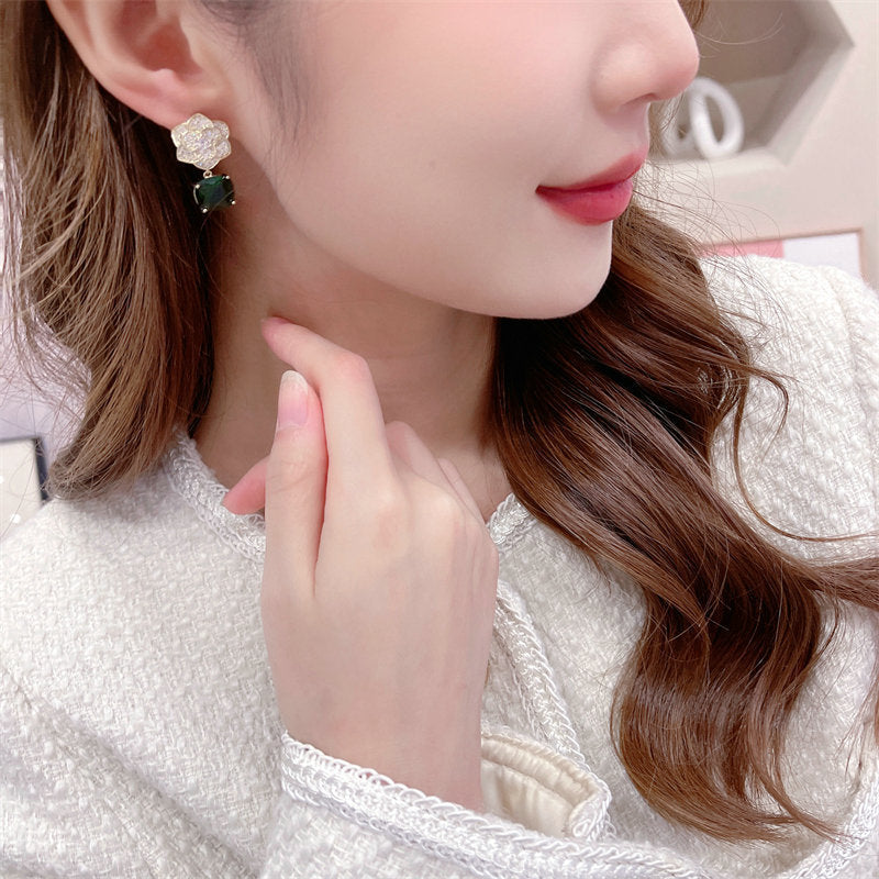2025 Douyin's explosive new trendy camellia zircon earrings for women's high-end green crystal temperament light luxury earrings for women