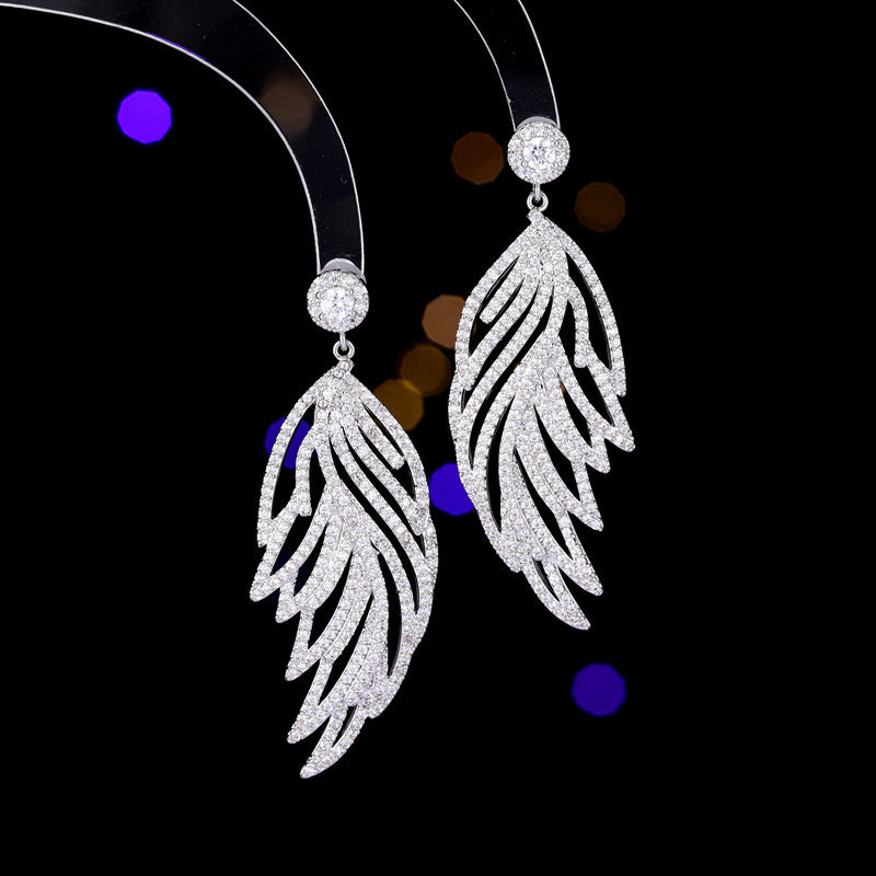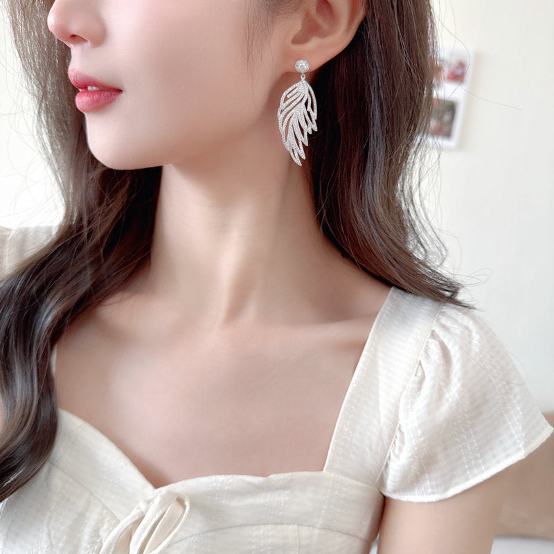 2025 high-end micro-inlaid zirconium hollow leaf feather earrings women's s925 silver needle niche design fashion earrings
