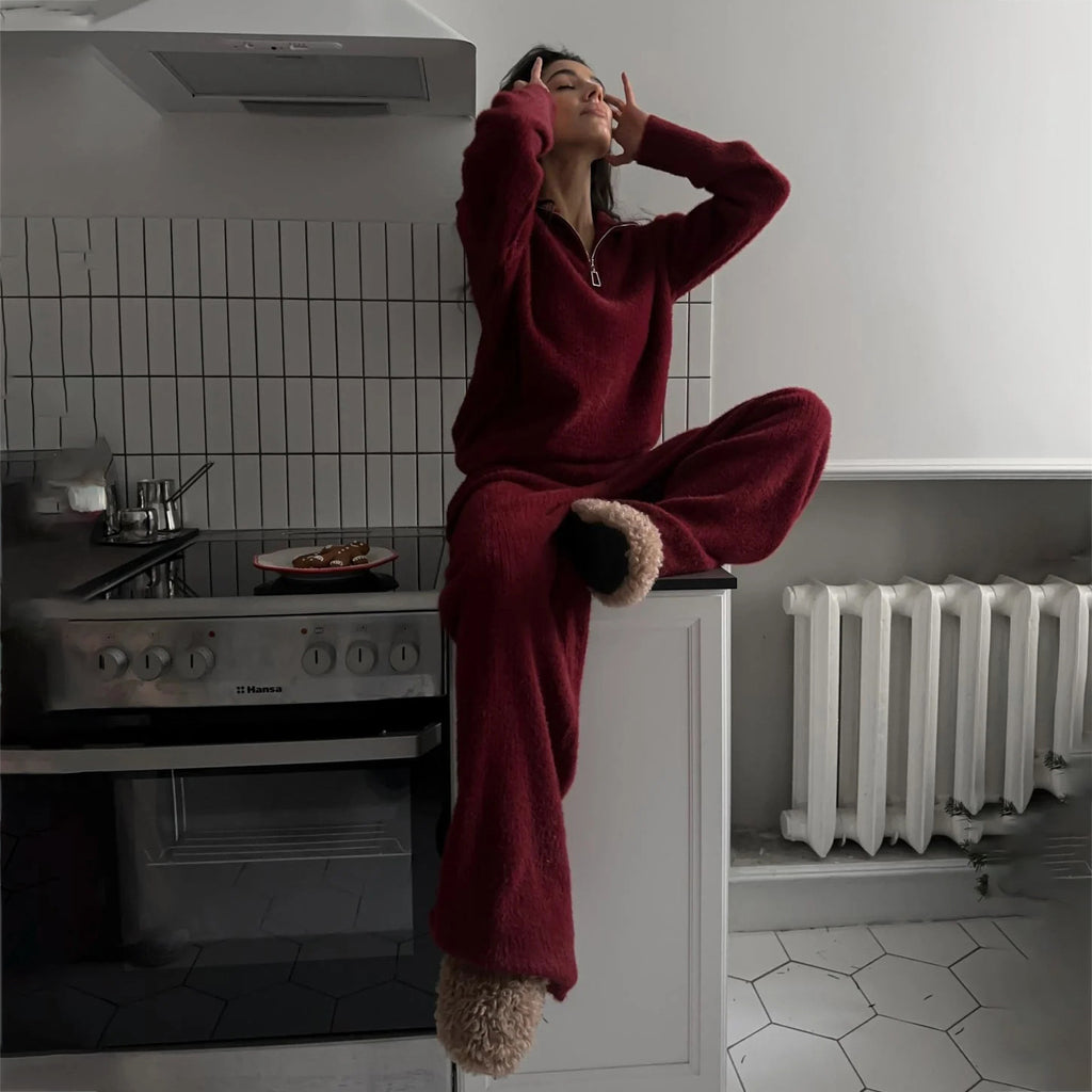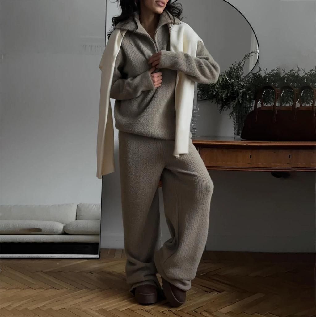 2025 Lazy style fashion semi-zipper casual sweater set women's high-end spring and autumn trend set women's two-piece set