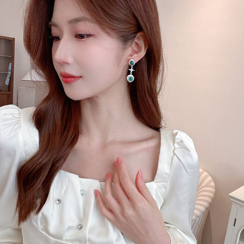 2025 New Chinese light luxury fashion emerald imitation chalcedony zircon earrings long high-end earrings female celebrity style stud earrings