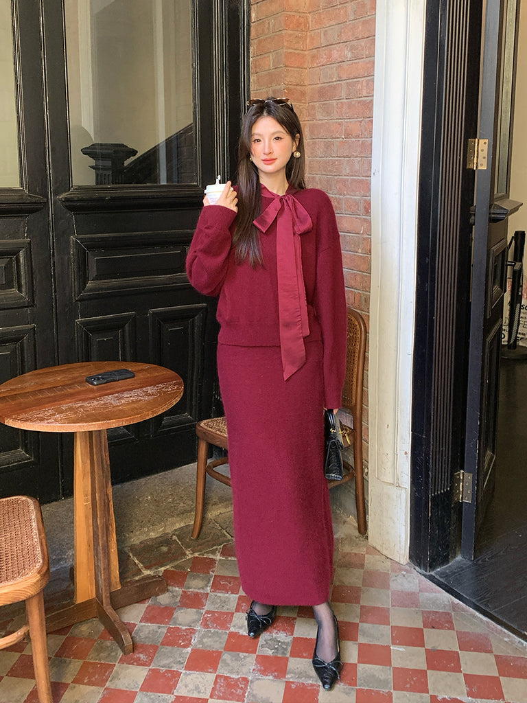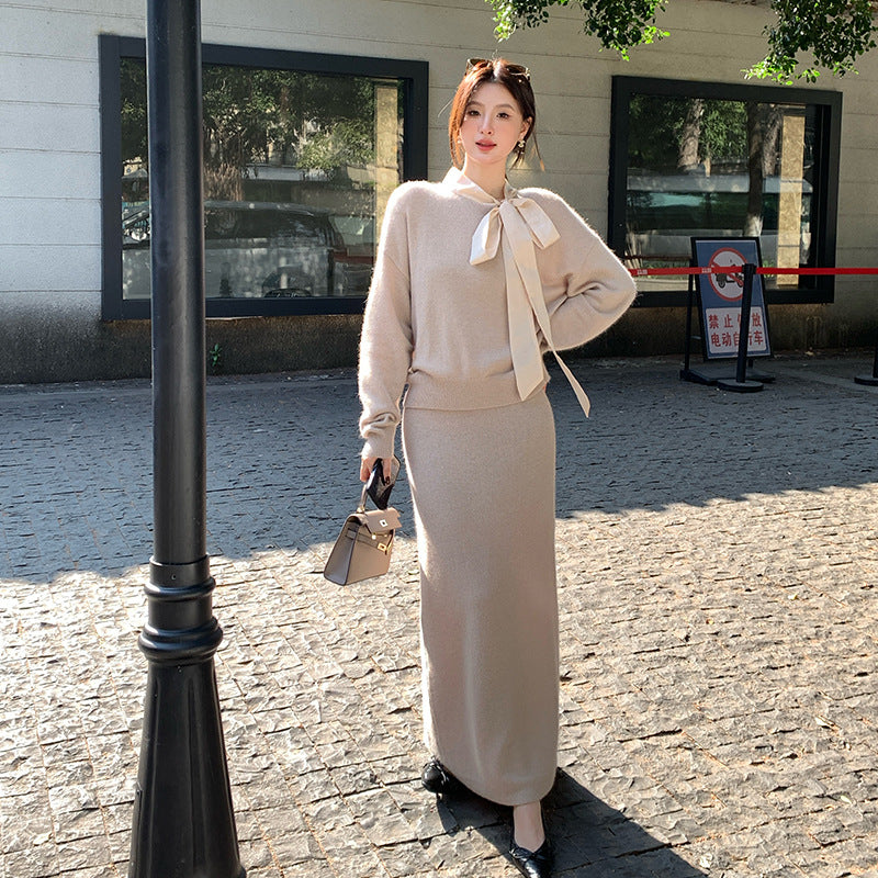 2025 popular autumn and winter new temperament bow knitted top + A-shaped half-length skirt two-piece set 25201