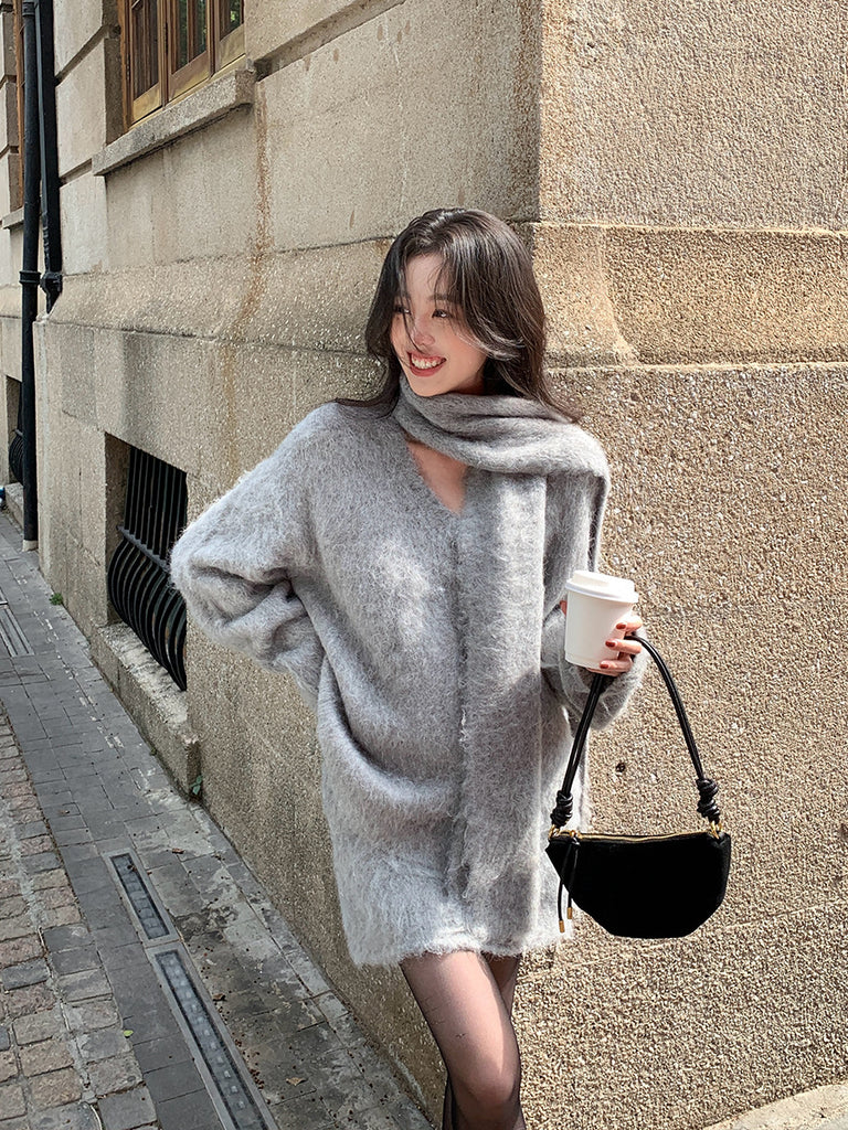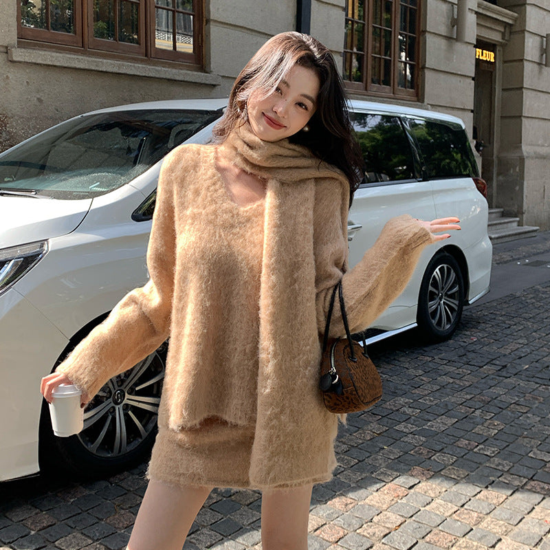 2025 popular autumn and winter new wool knitted sweater with scarf + hip skirt two-piece set 25184