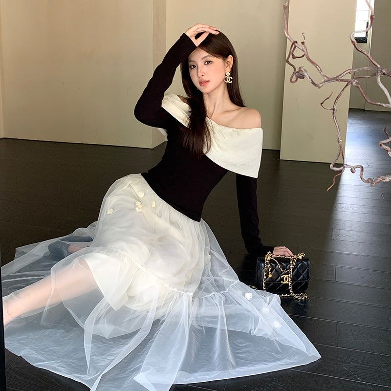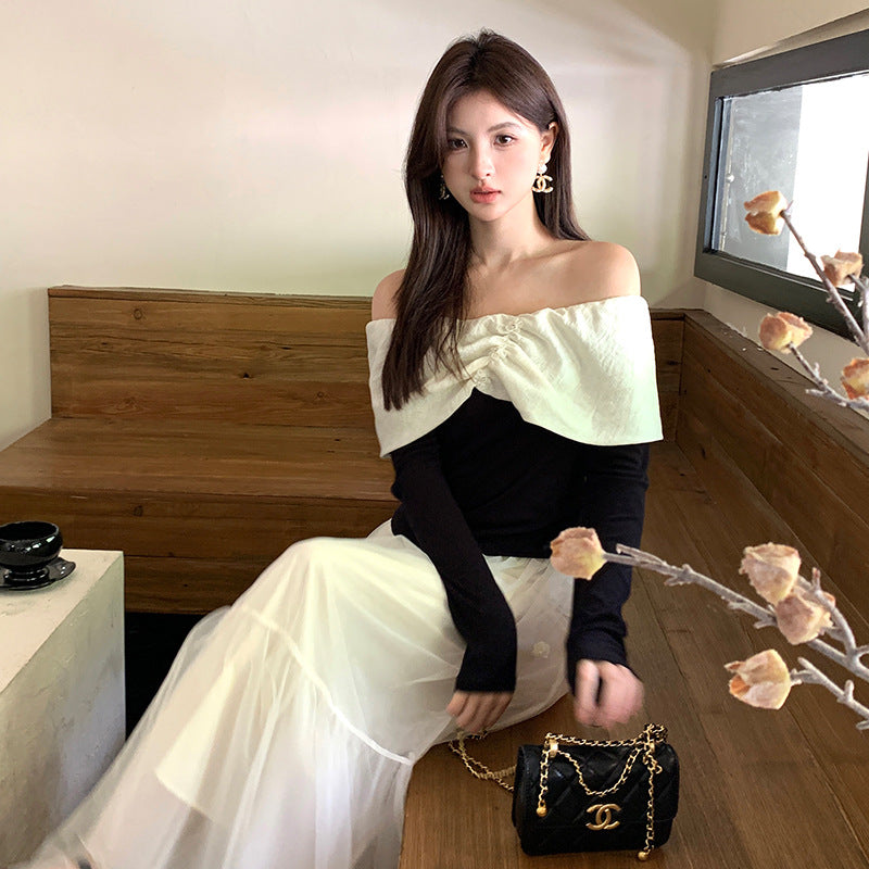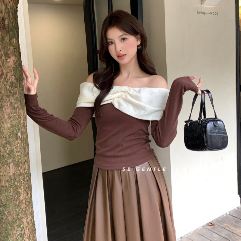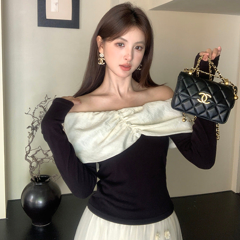 2025 popular autumn new temperament one-word collar versatile bottoming shirt long-sleeved knitted sweater women's top 89105