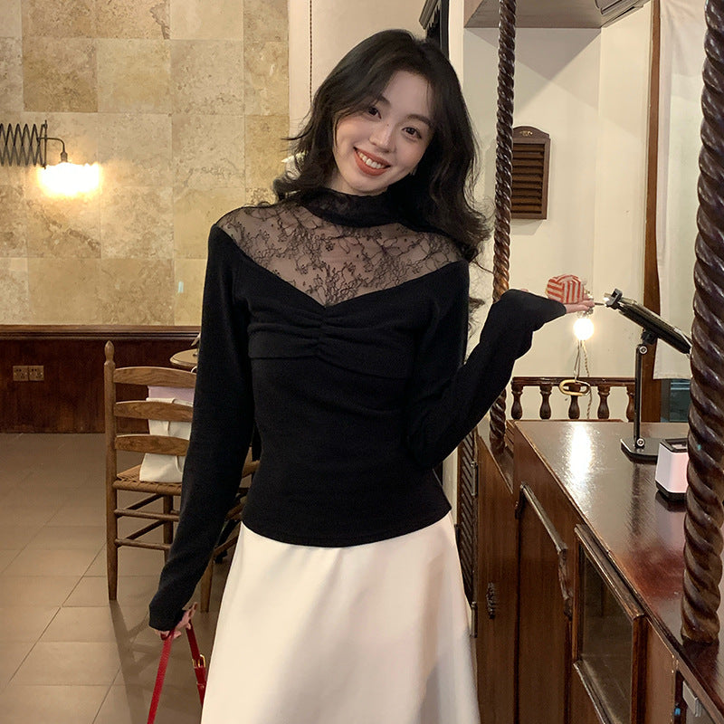 2025 popular winter new temperament stand-up collar lace bottoming shirt women's versatile top trendy 89187