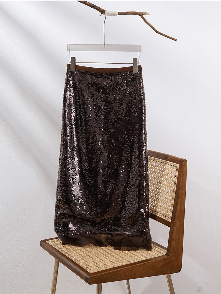 2025 Popularan goods early spring high-end heavy industry sequined skirt women's niche designer chocolate brown skirt
