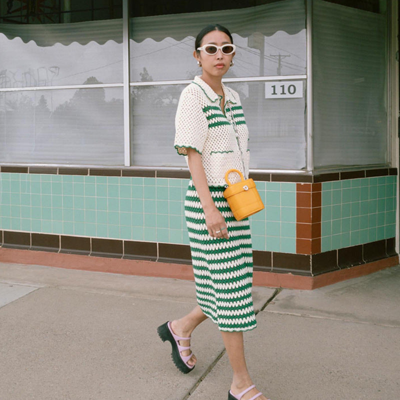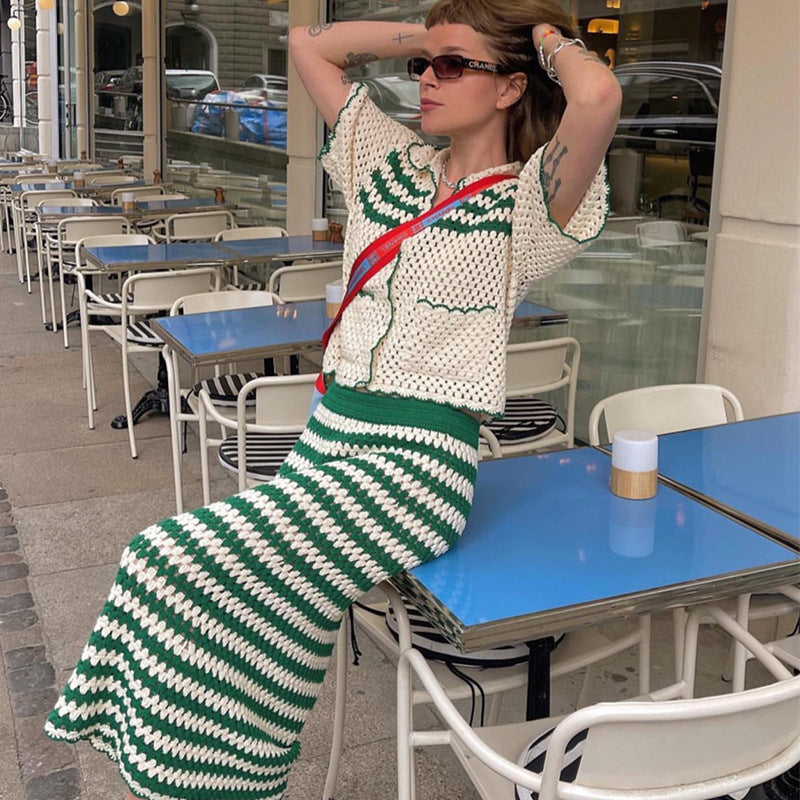 2025knitted fashion two-piece suit for women, striped lapel hollow short-sleeved top and skirt new suit for women