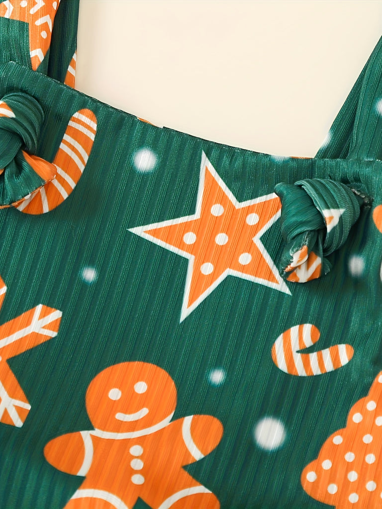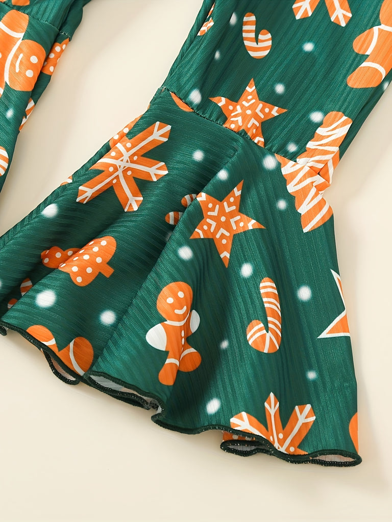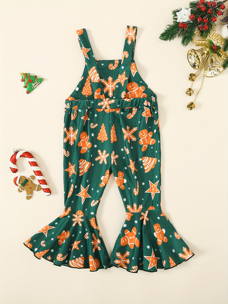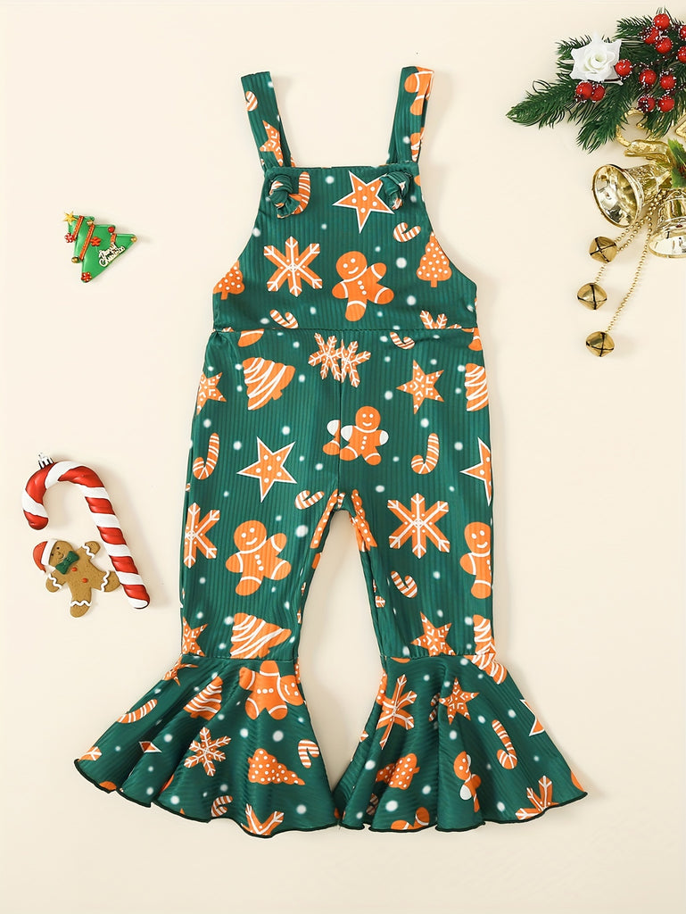 Adorable Toddler Girls' Gingerbread Man Print Flare Pants Romper Jumpsuit - Soft and Comfy Christmas Party Outfit for Kids - Festive Holiday Clothing for Little Girls