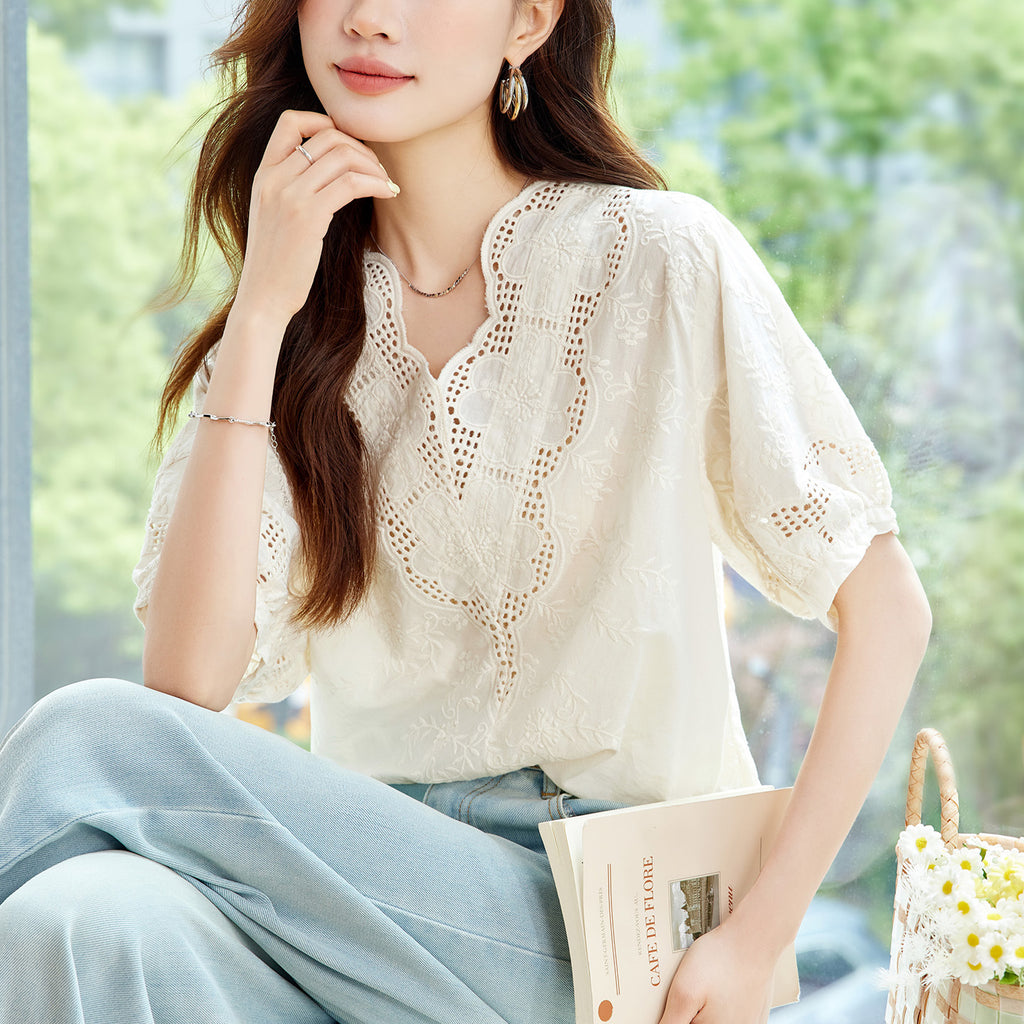 Cotton Cocoon V-Neck Positioning Embroidered Short Sleeve Shirt