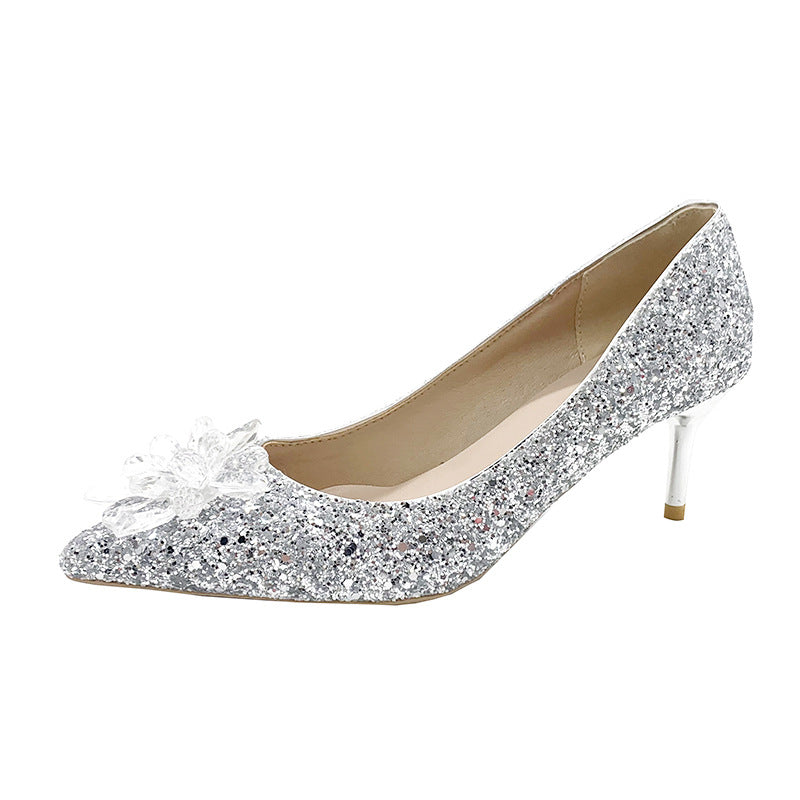 kamames kamames Crystal Silver Bride Shoes 2023 Autumn Tip Chinese Wedding Shoes Silver High Heels High Heels Heel Sequins
