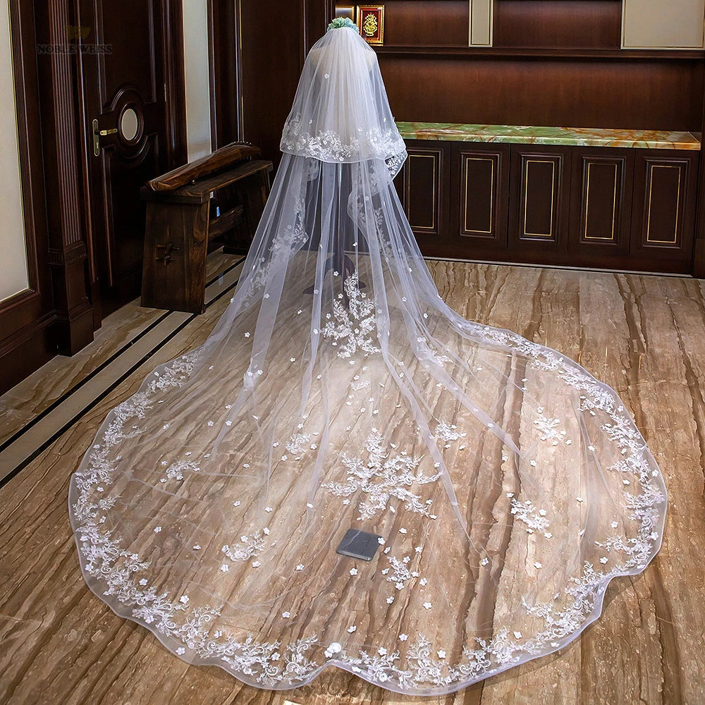 kamames Long Wedding Veils With Comb Two Layers Appliques Bride Veil Lace Edge Tulle Veils Accessories 3m*4m