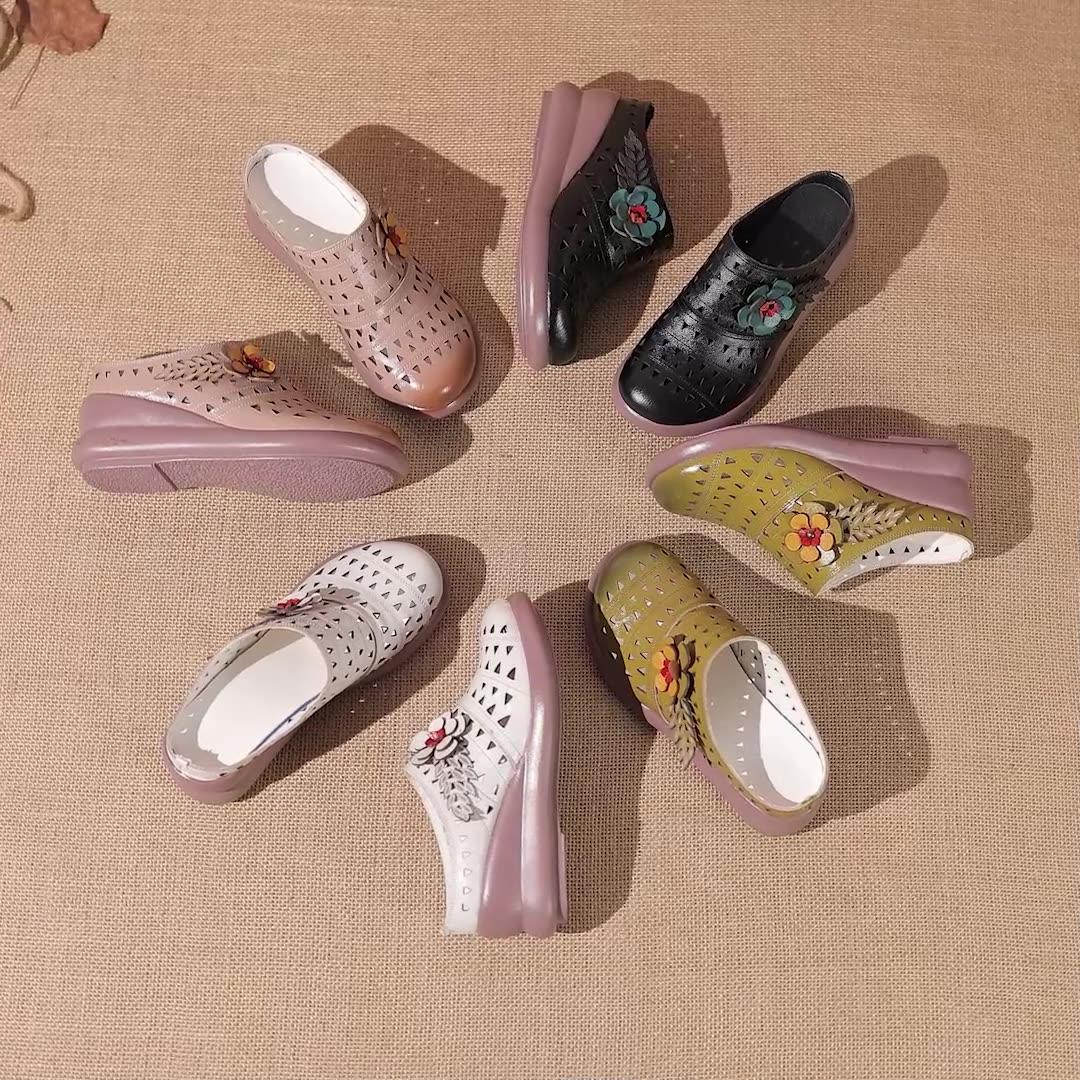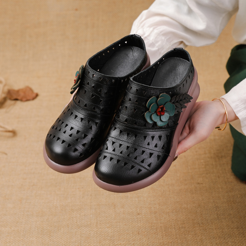 kamames New Loose Cake Bottom Casual Women's Shoes National Wind Leather Flower Hollow Out Women's Slippers Breathable Comfortable Hole Hole Shoes