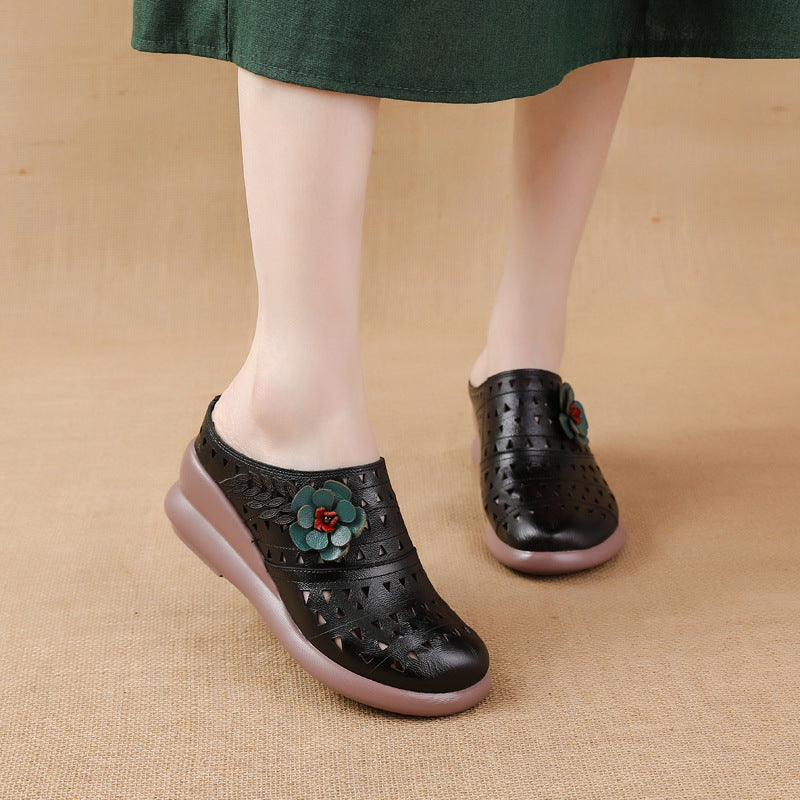 kamames New Loose Cake Bottom Casual Women's Shoes National Wind Leather Flower Hollow Out Women's Slippers Breathable Comfortable Hole Hole Shoes