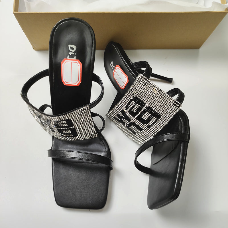 kamames Sandals Women 2022 Luxury Brand Letter Fashion Summer Sexy Crystal Rhinestone High Heels Stiletto Wedding Shoes Woman Slippers