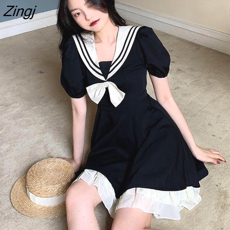 kamames Sleeve Dress Women Sailor Collar Patchwork Preppy Style Vintage Elegant All-match Leisure Female Summer New Cozy Vestido
