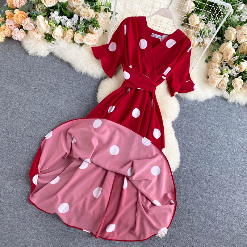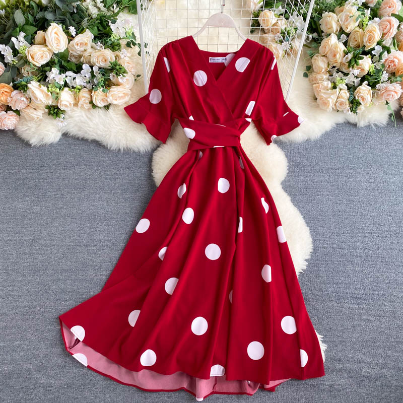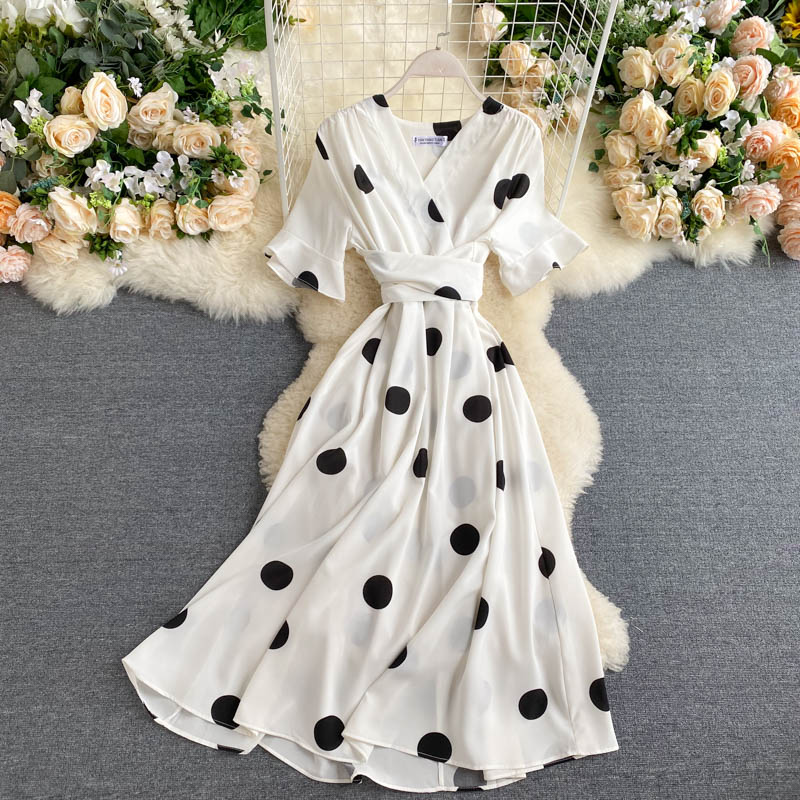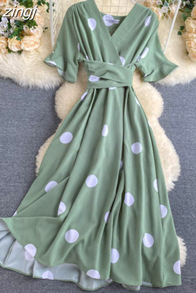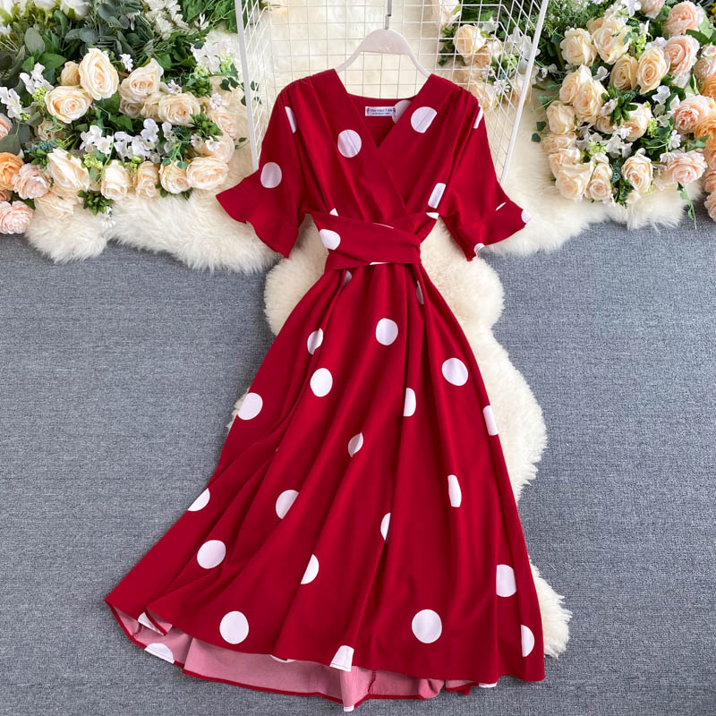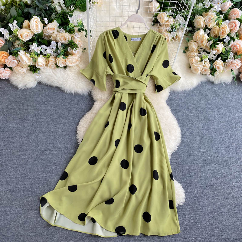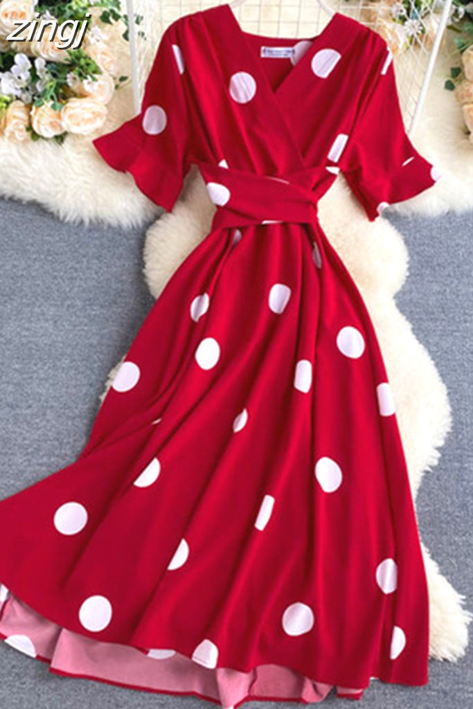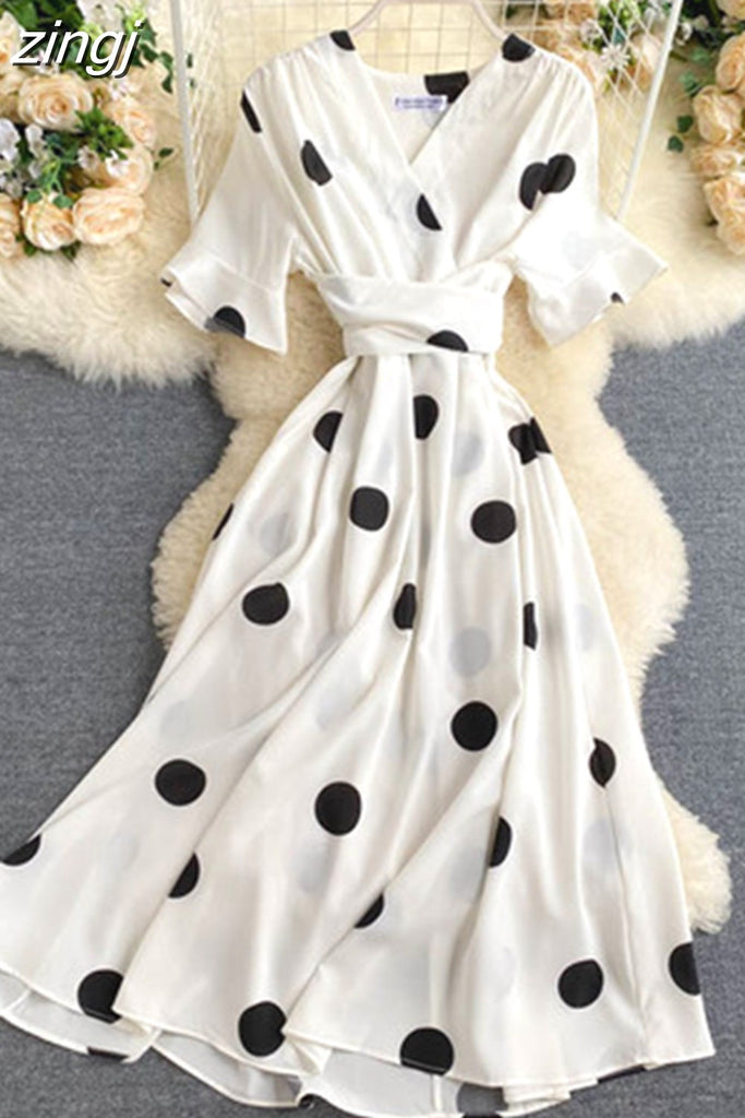 kamames Women Polka Dot Midi Dress Vintage V-Neck Short Flare Sleeve Bandage A-Line Vestidos Female Casual Robe New Fashion