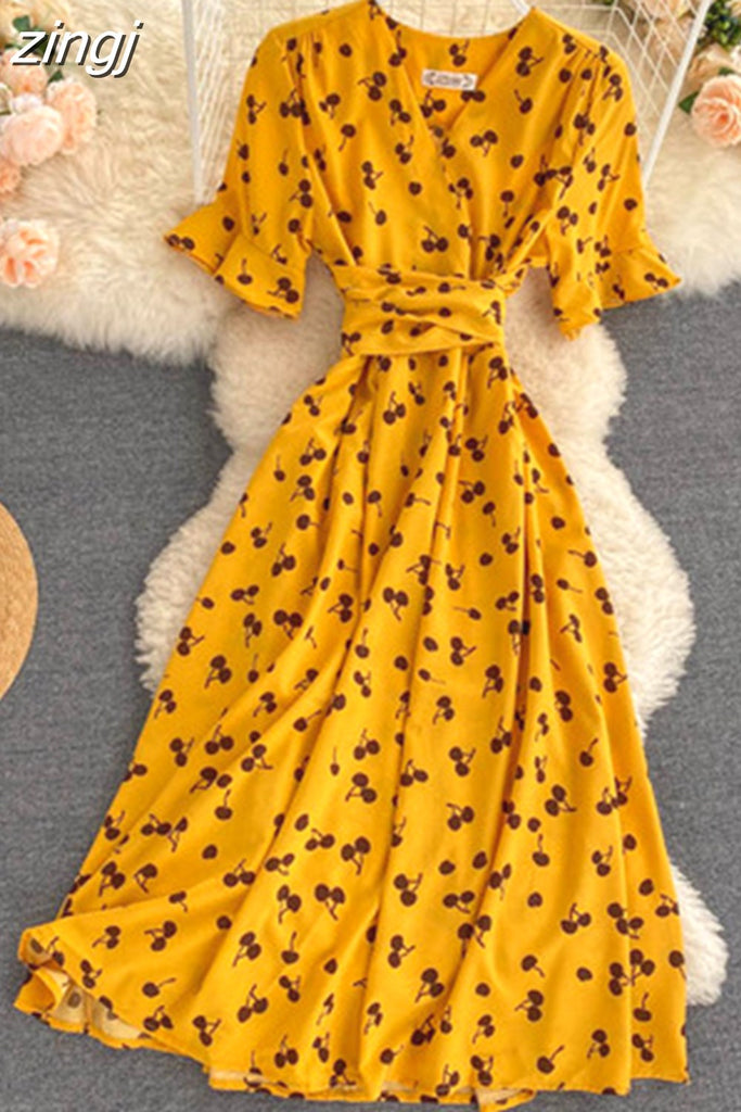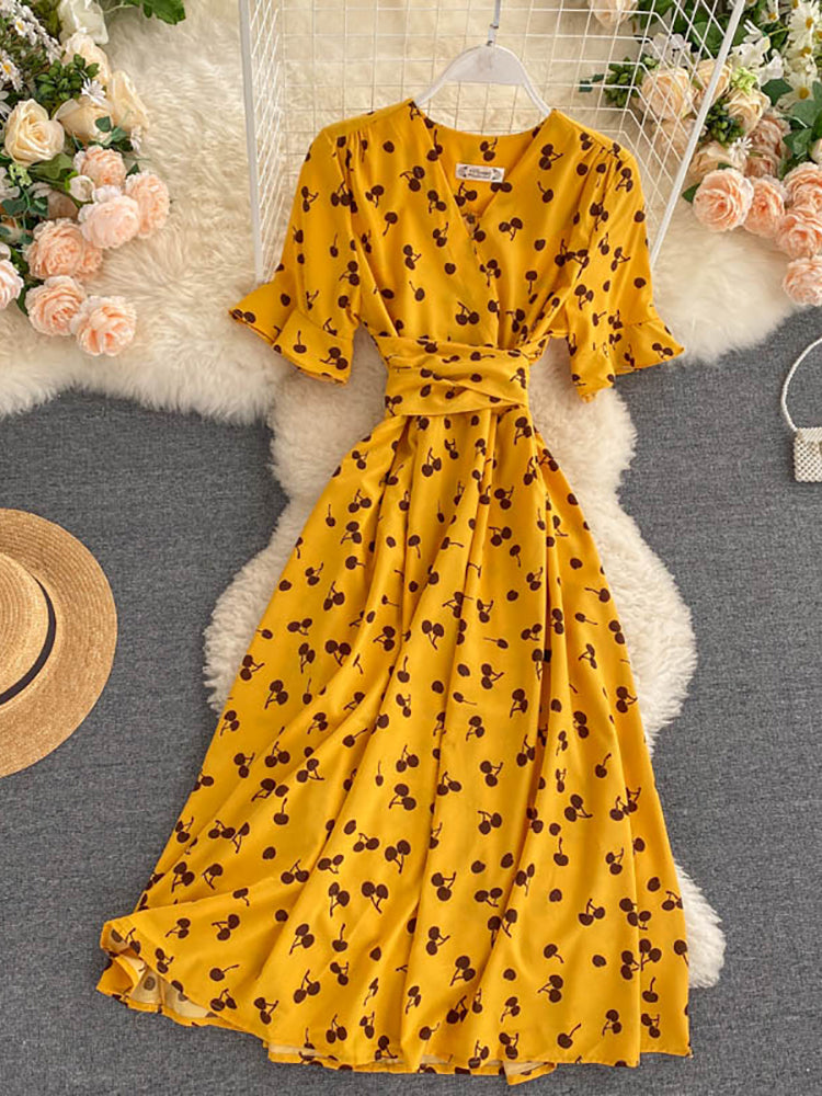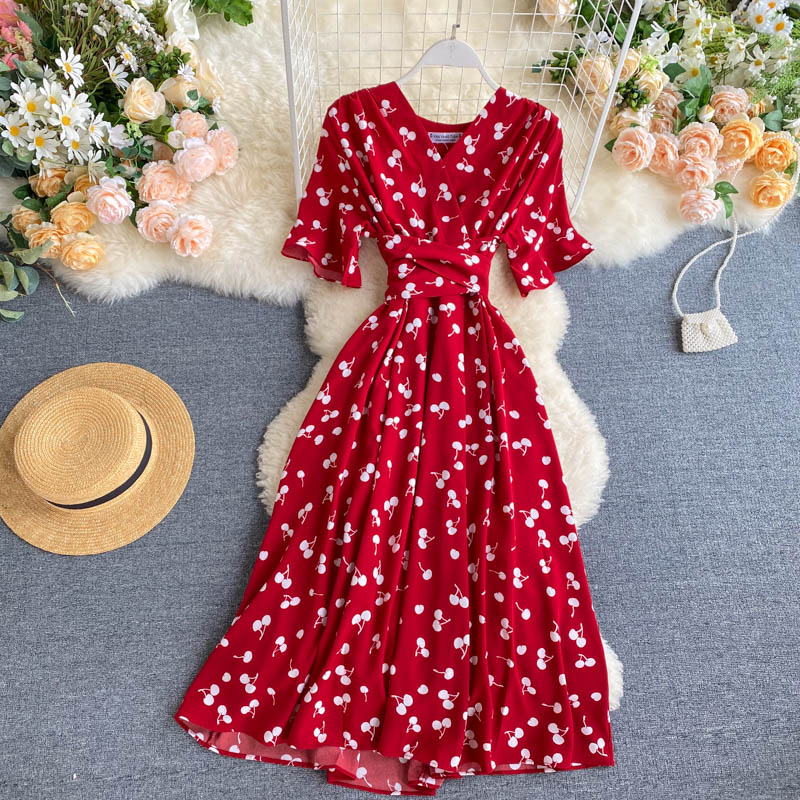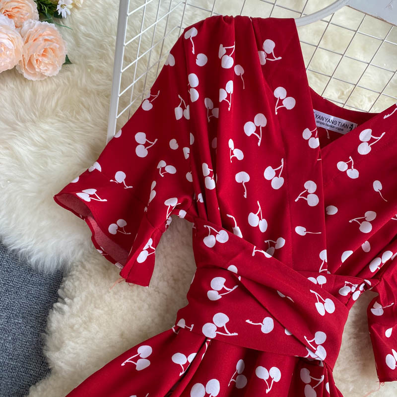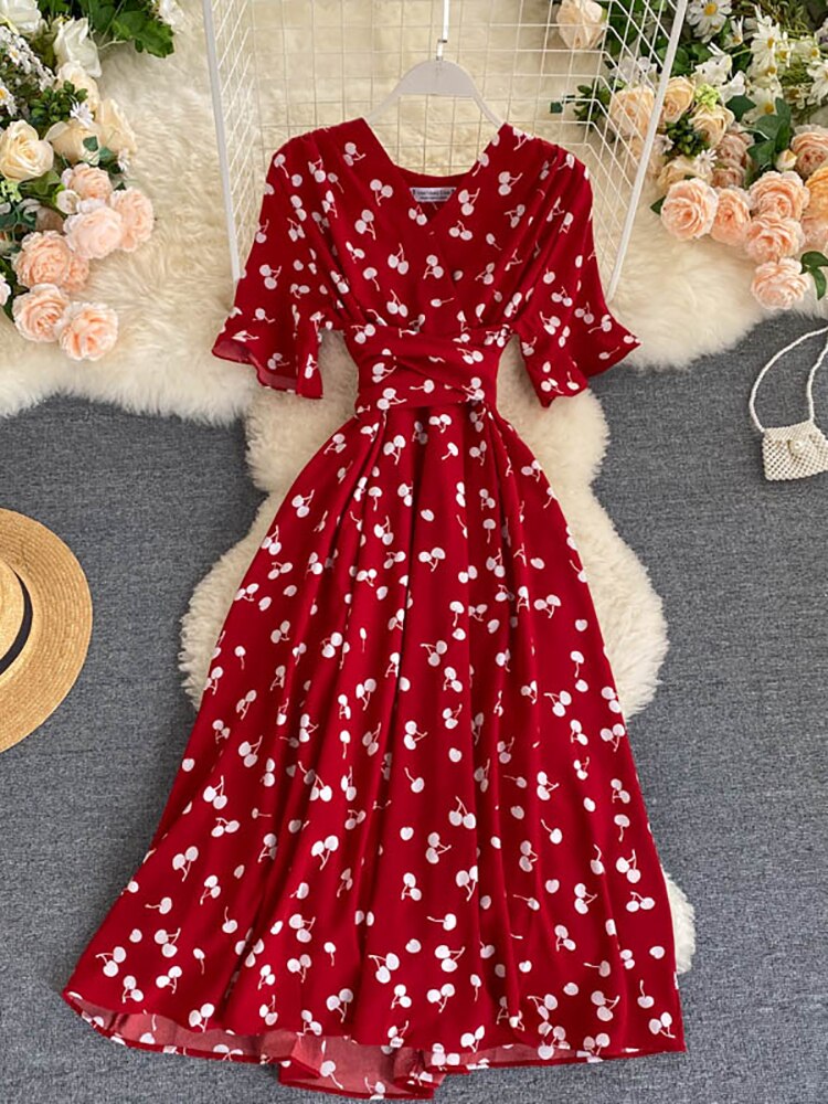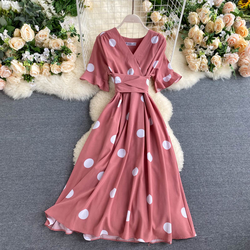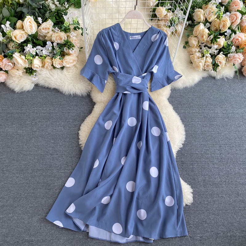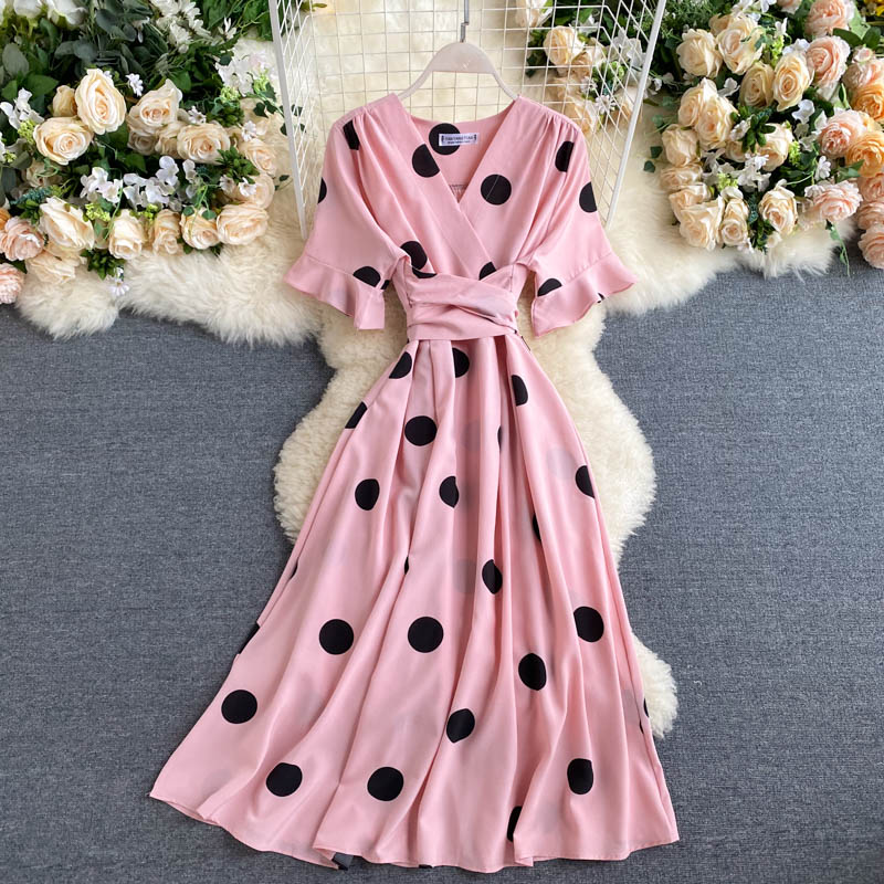 kamames Women Polka Dot Midi Dress Vintage V-Neck Short Flare Sleeve Bandage A-Line Vestidos Female Casual Robe New Fashion