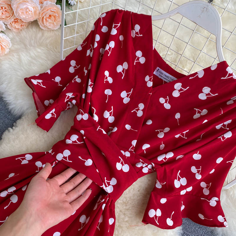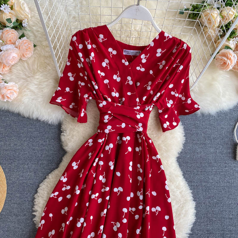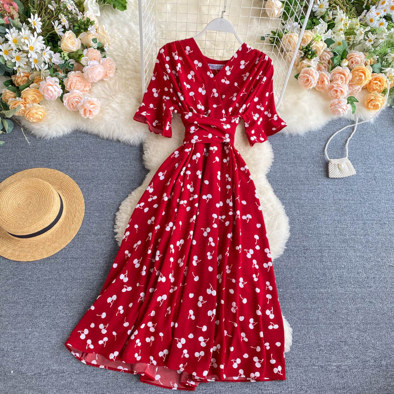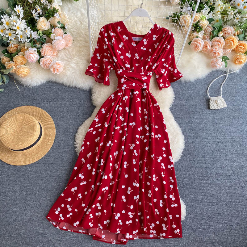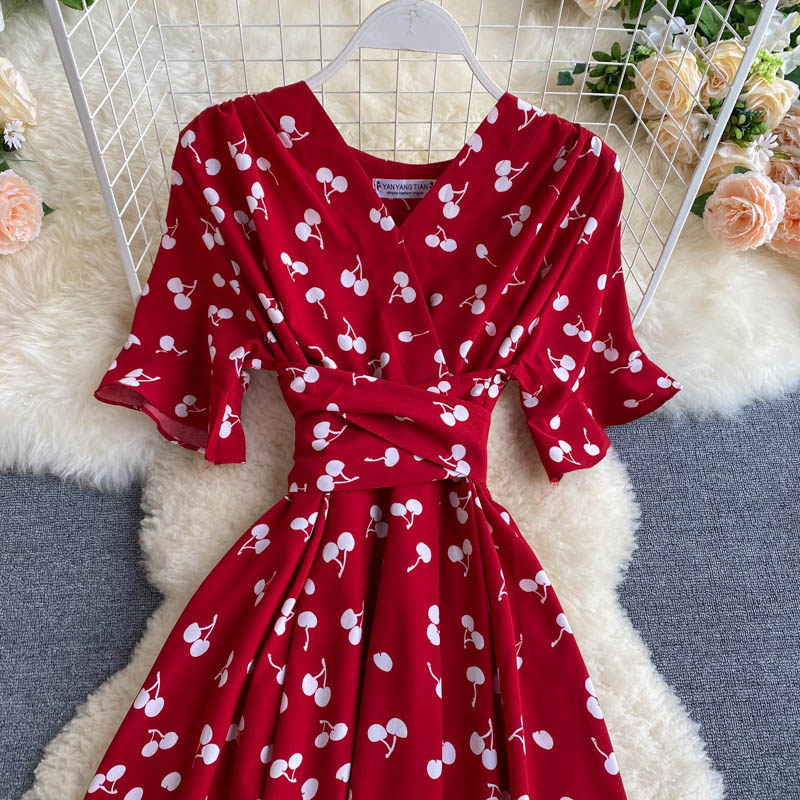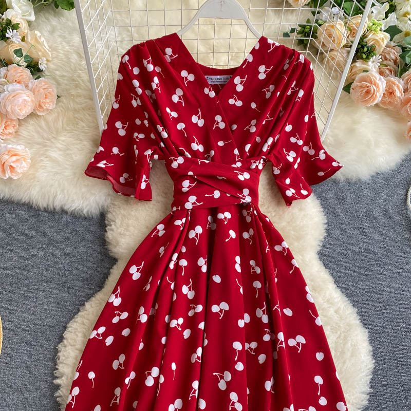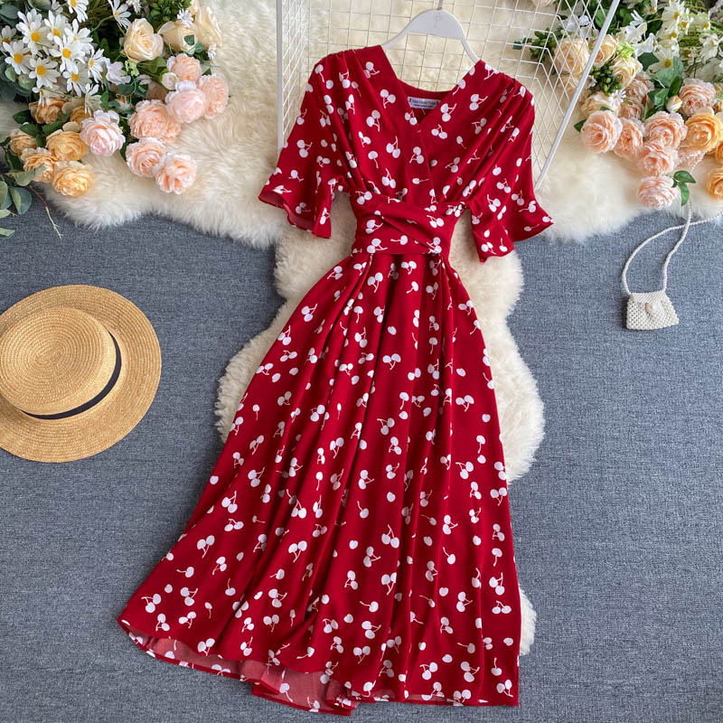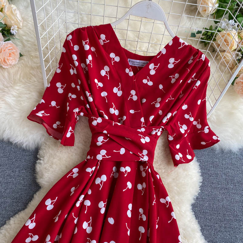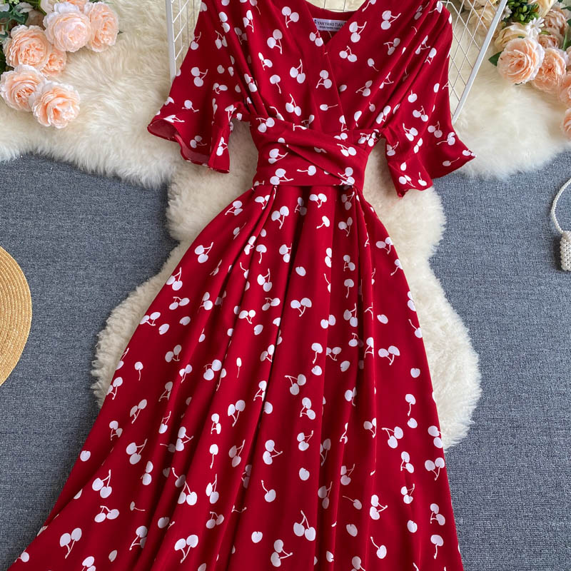 kamames Women Polka Dot Midi Dress Vintage V-Neck Short Flare Sleeve Bandage A-Line Vestidos Female Casual Robe New Fashion