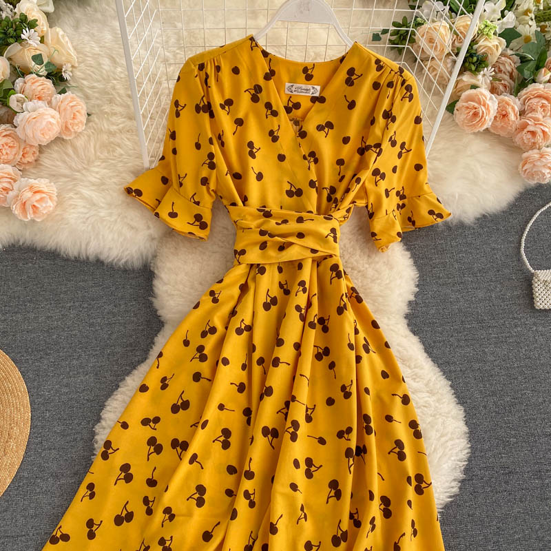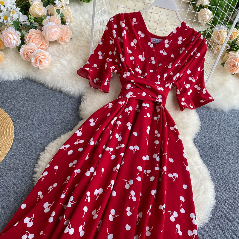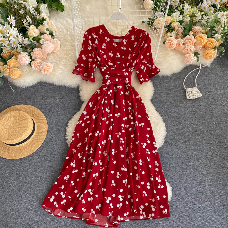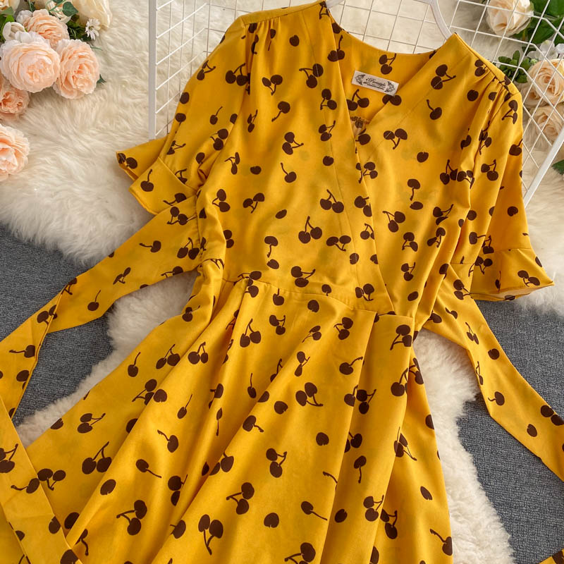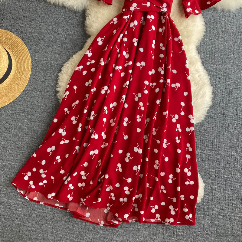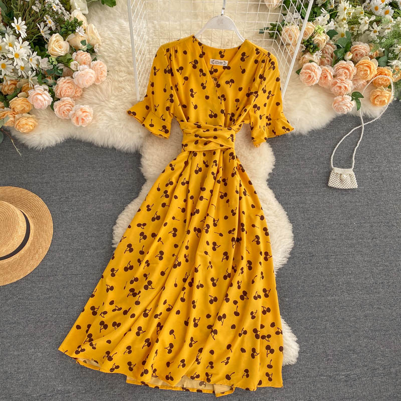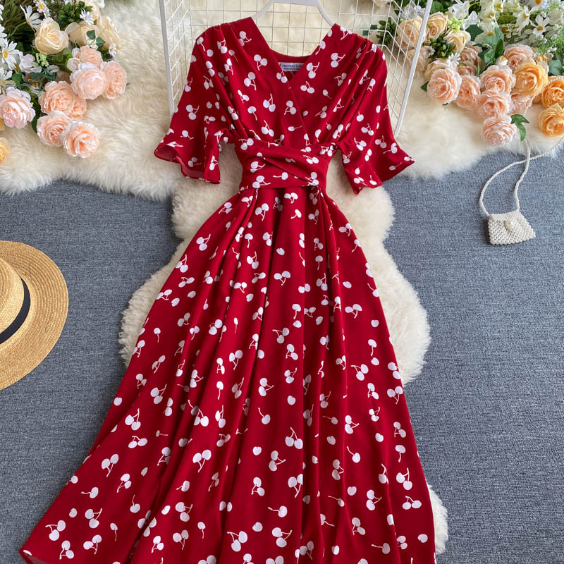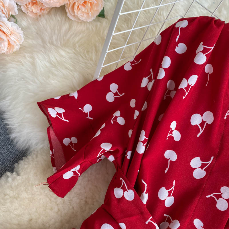 kamames Women Polka Dot Midi Dress Vintage V-Neck Short Flare Sleeve Bandage A-Line Vestidos Female Casual Robe New Fashion