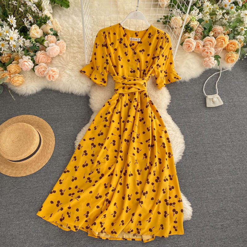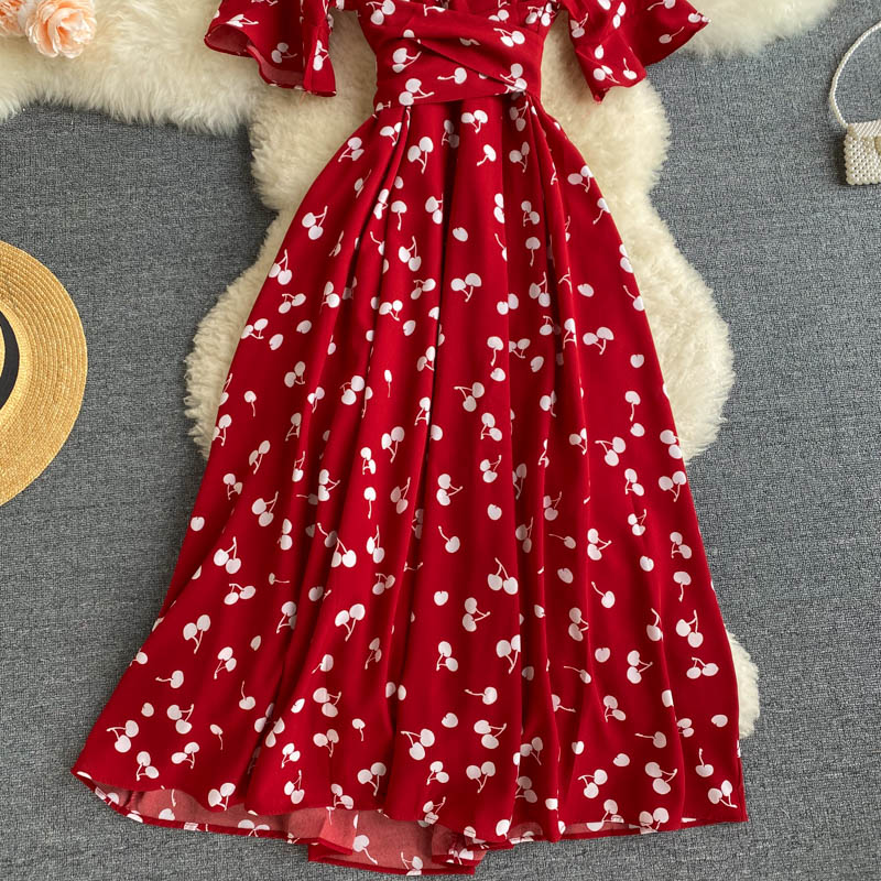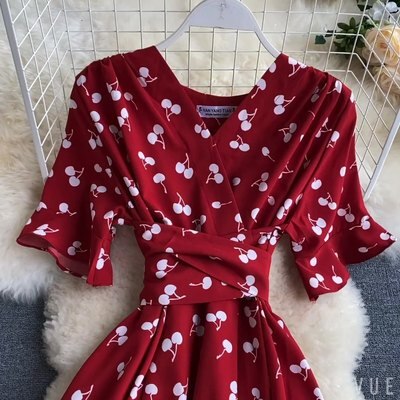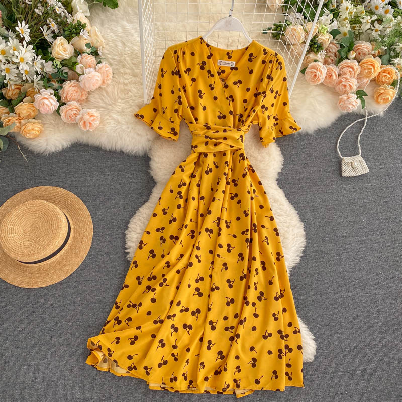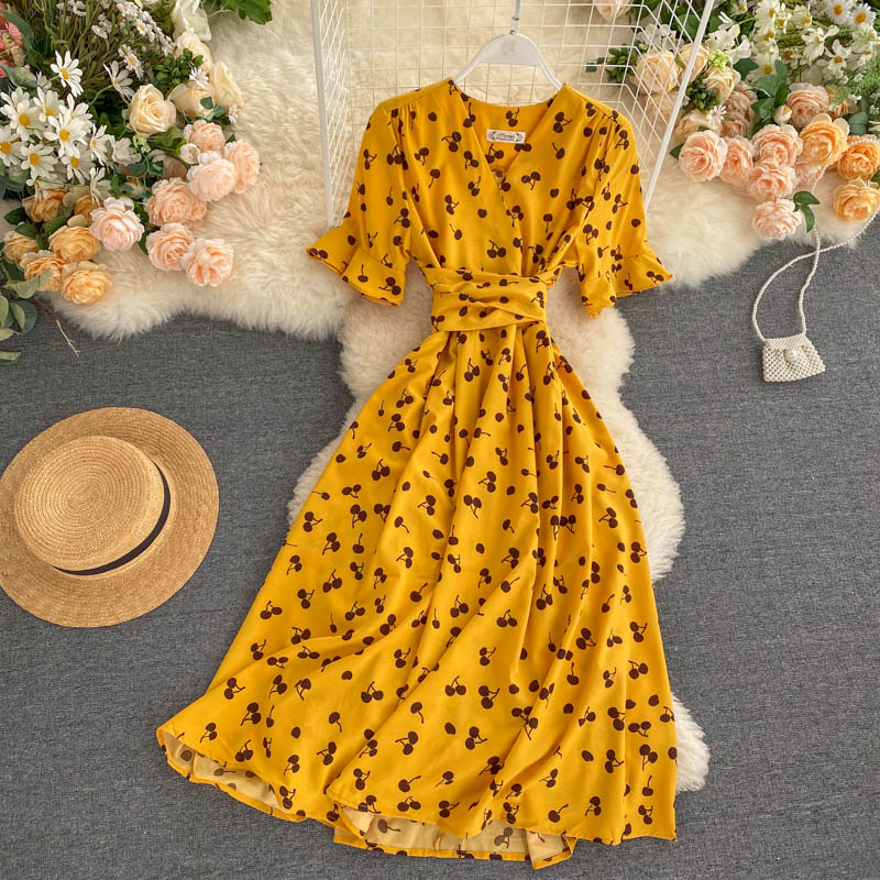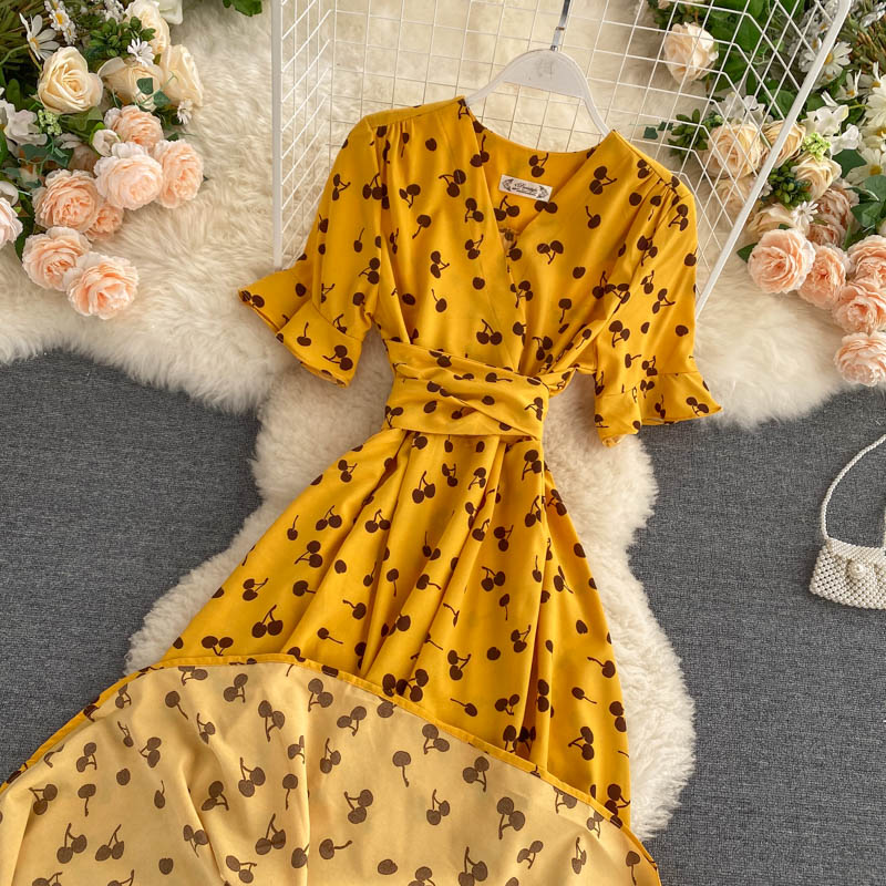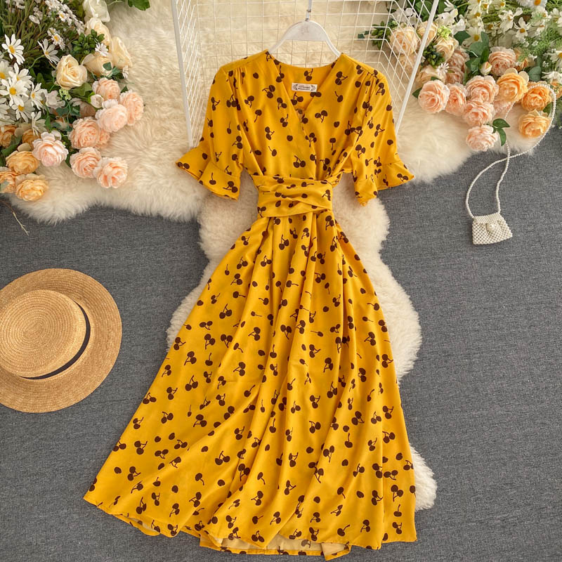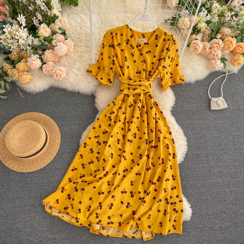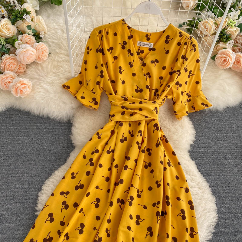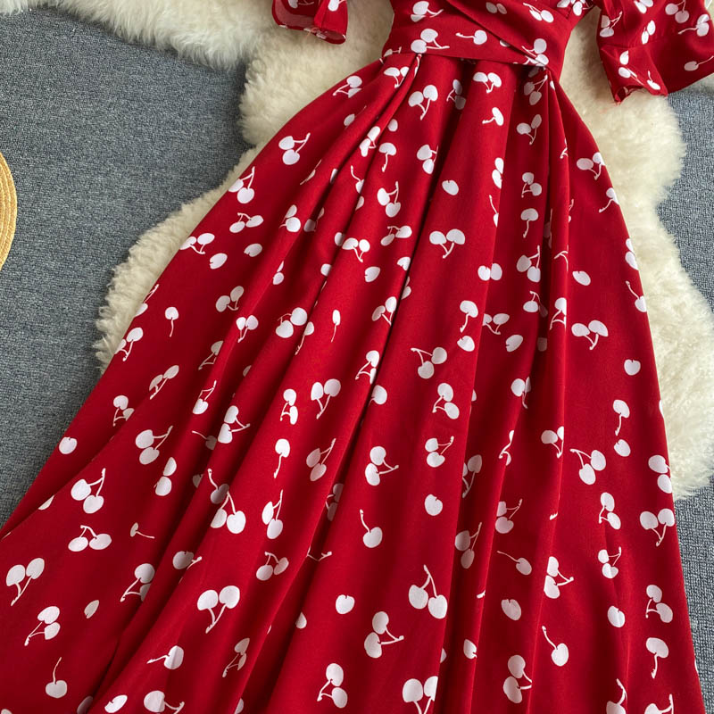 kamames Women Polka Dot Midi Dress Vintage V-Neck Short Flare Sleeve Bandage A-Line Vestidos Female Casual Robe New Fashion