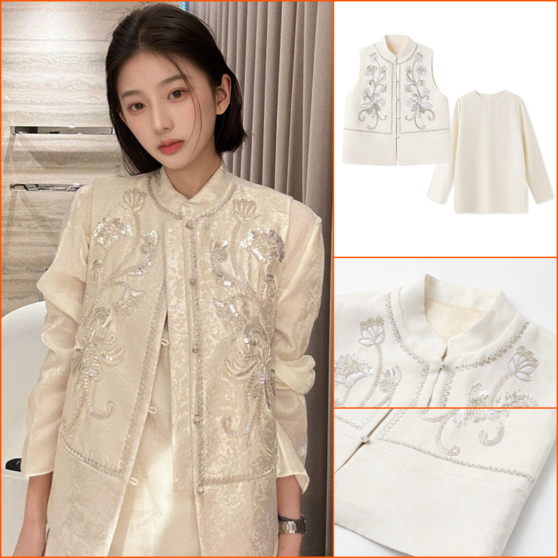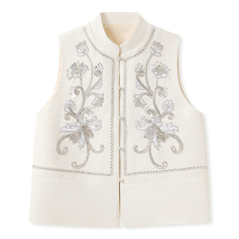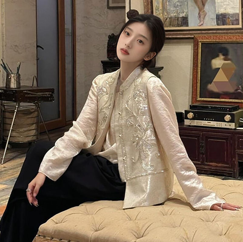 New Chinese high-end sequined embroidered design shirt spring national style disc-buckled stand-up collar vest MZ064