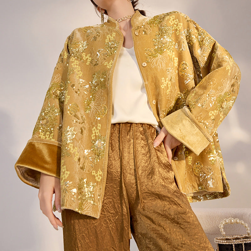 New Chinese style new satin flower embroidered shirt sequined gold high-end temperament top M3006