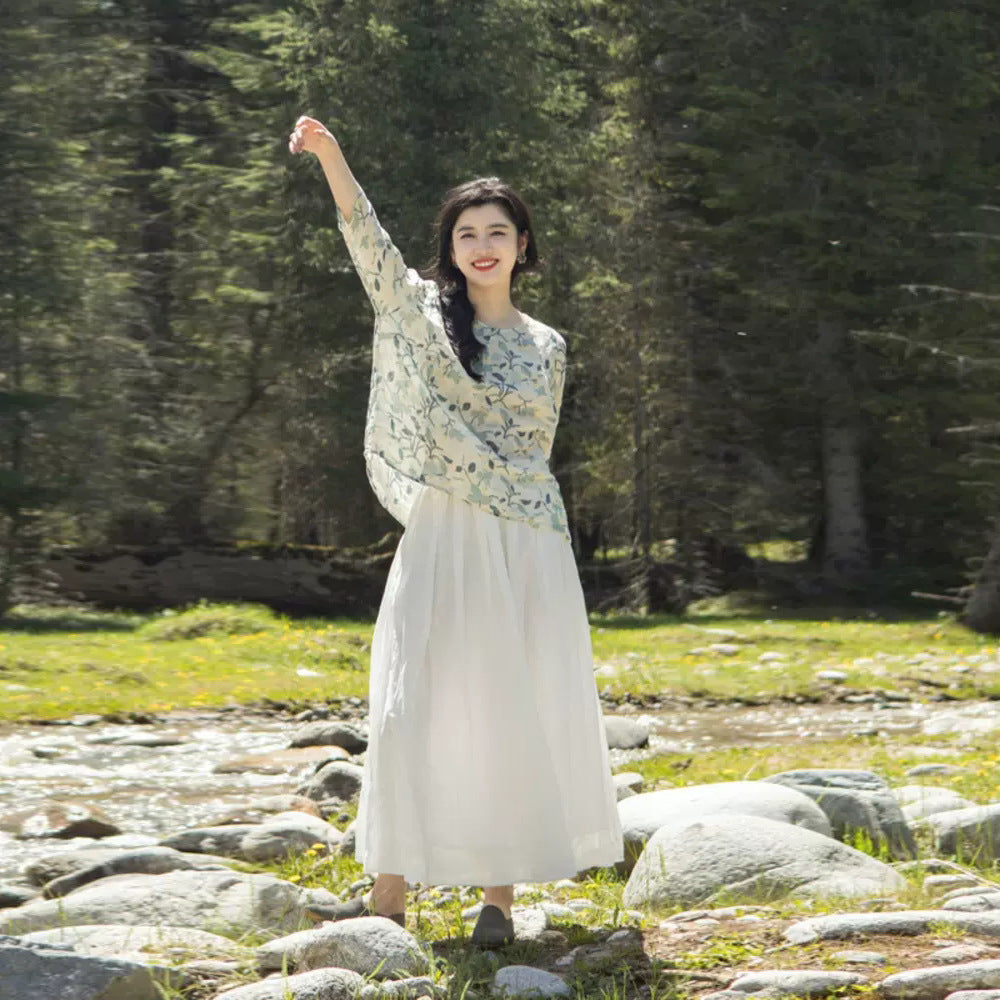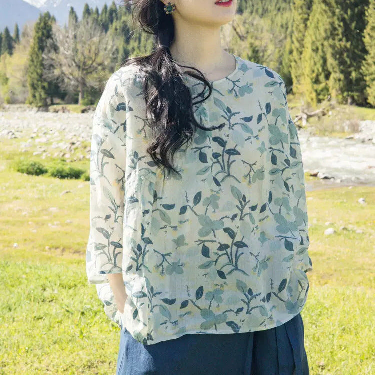 New Chinese top, diagonal shirt, seven-quarter-sleeved ramie printed literary loose shirt A0762