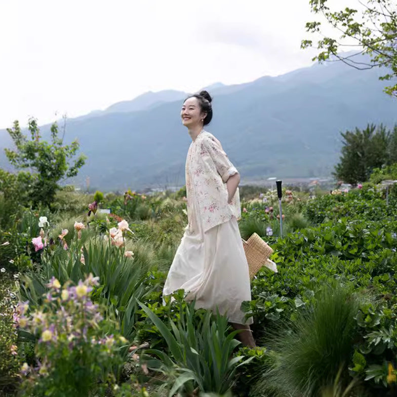 popular elegant, printed shirt ramie niche retro literary floral top women's summer new tea clothes A0511