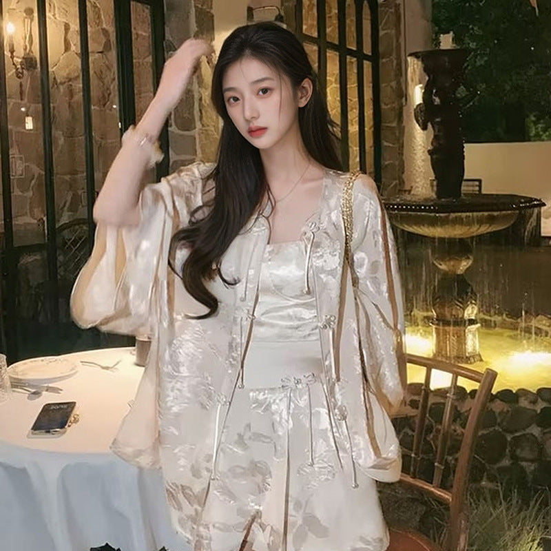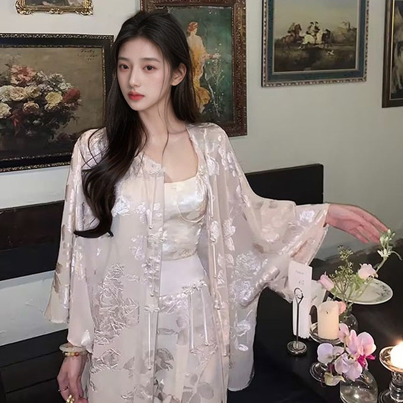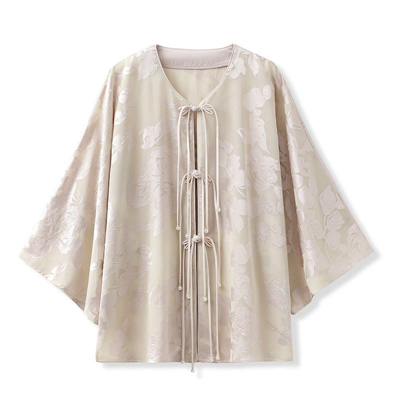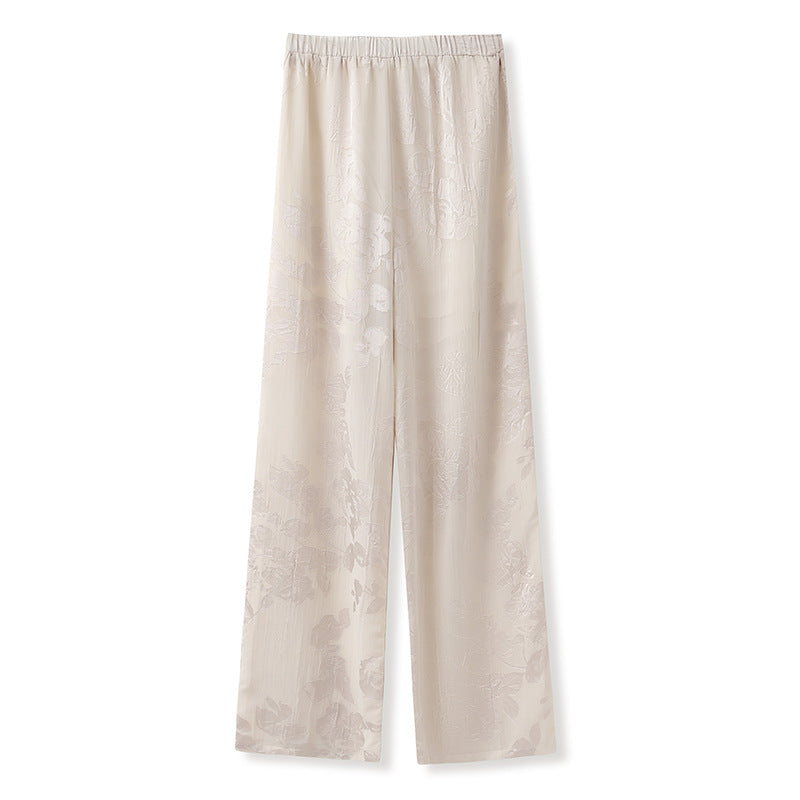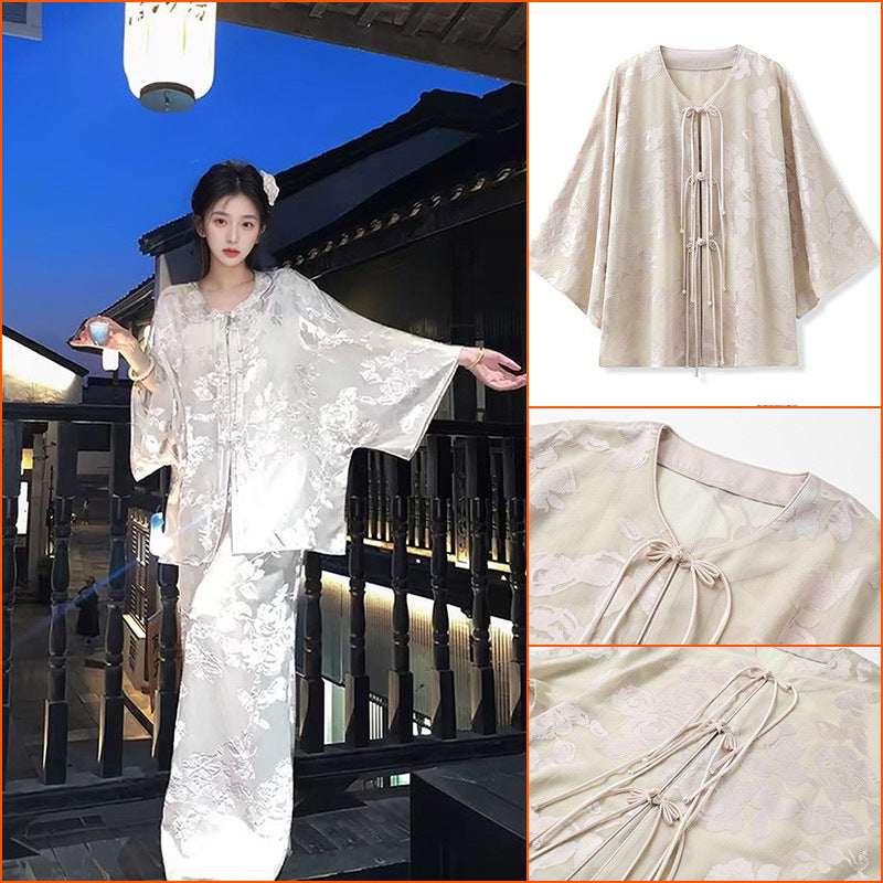 Popular new Chinese style flower branch printing disc button human silk shirt light luxury loose trousers set female M5071