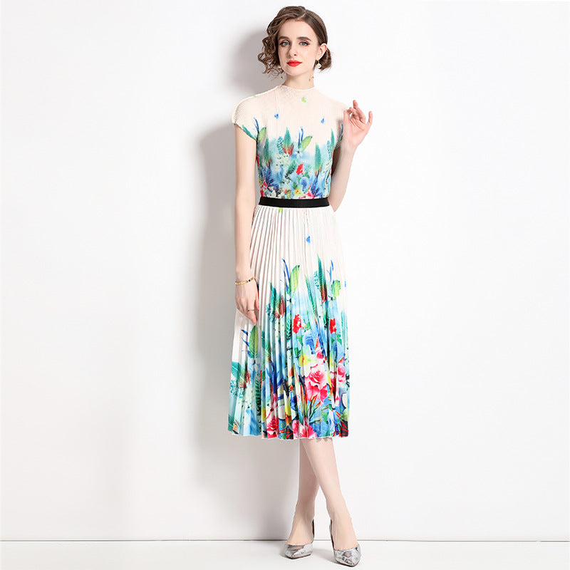 Salt girl feels like wearing a two-piece suit, women's summer tie-dye short T-shirt top, high waist pleated skirt