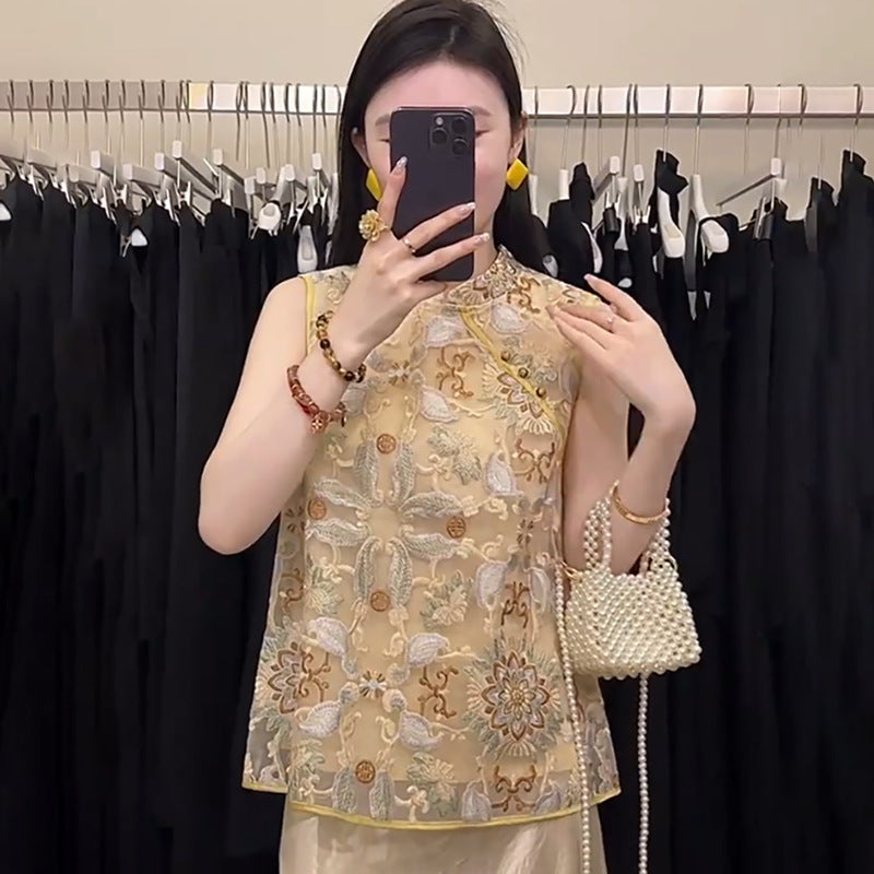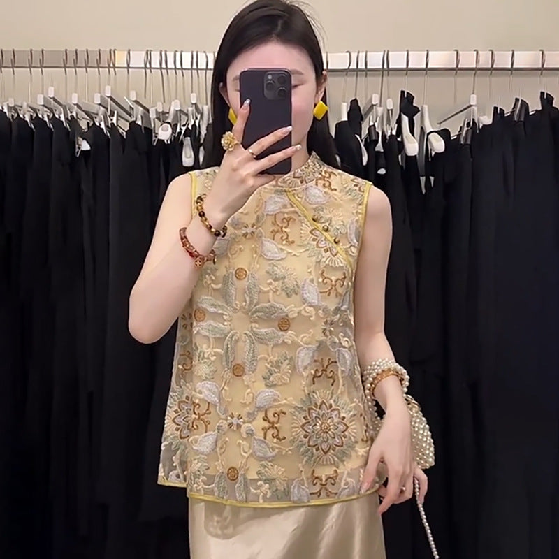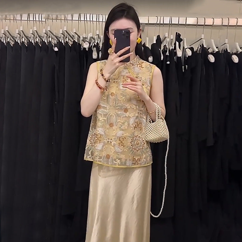 summer light luxury heavy industry retro vest national style new Chinese embroidered stand-up collar vest skirt set N4081