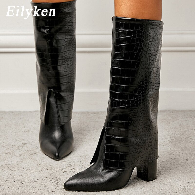kamames 2023 New Arrived Chunky High Heel Serpentine Pattern Shoes Designer Style Knee-High Boots Ladies Winter Footwear