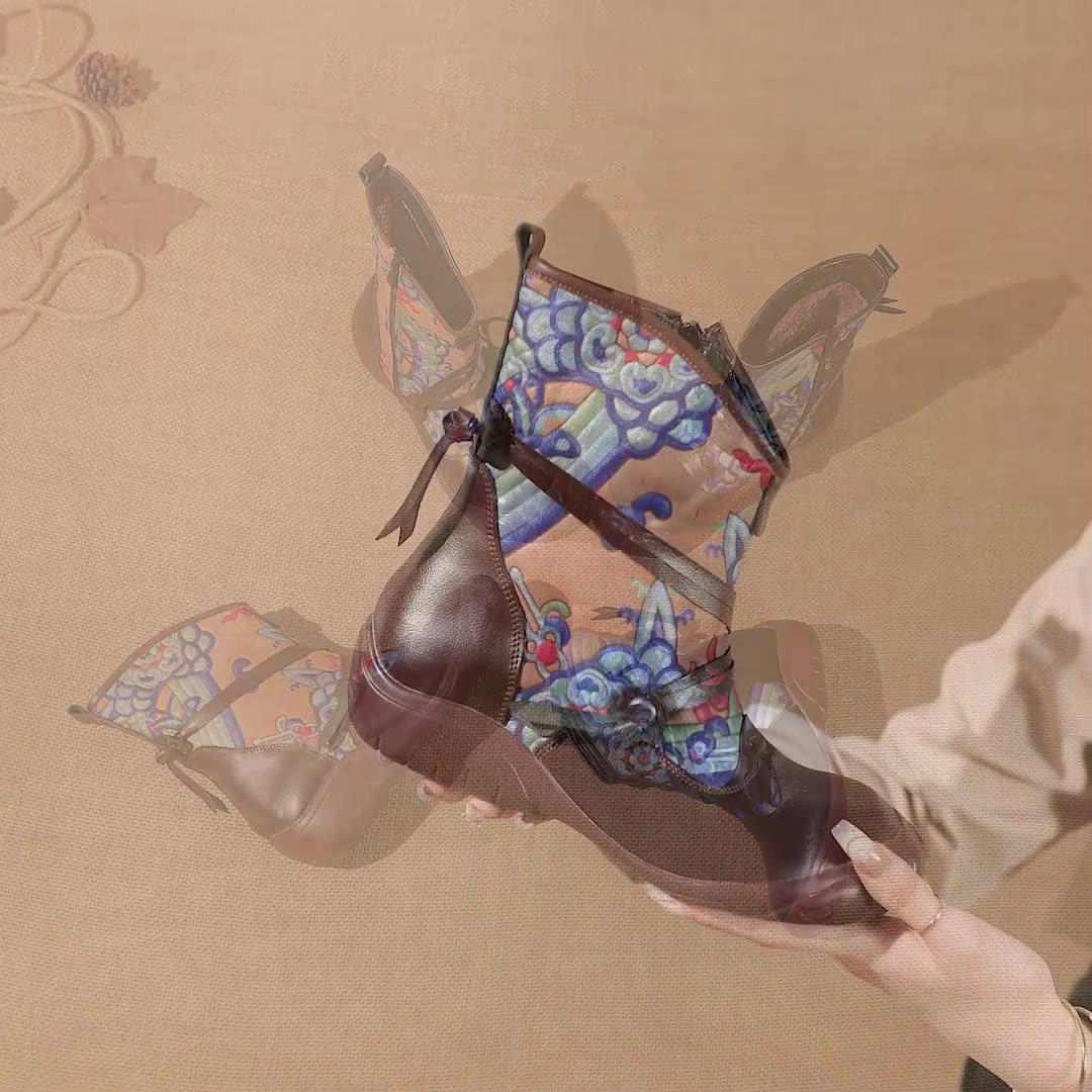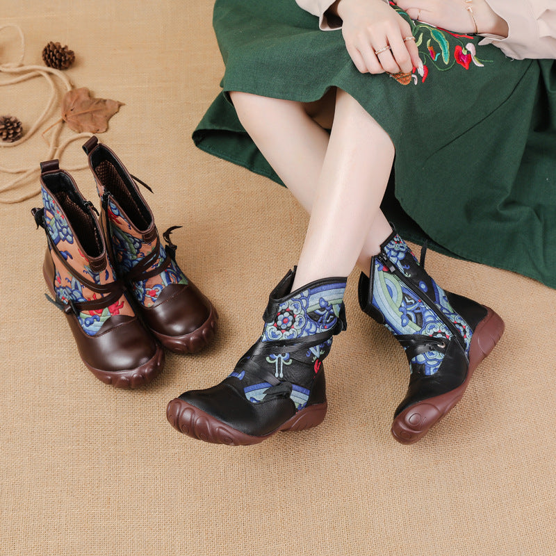 kamames And Winter New Flat Bottom Bottom Martin Boots National Wind Print Retro Leather Women's Boots Warm And Comfortable Cotton Shoes