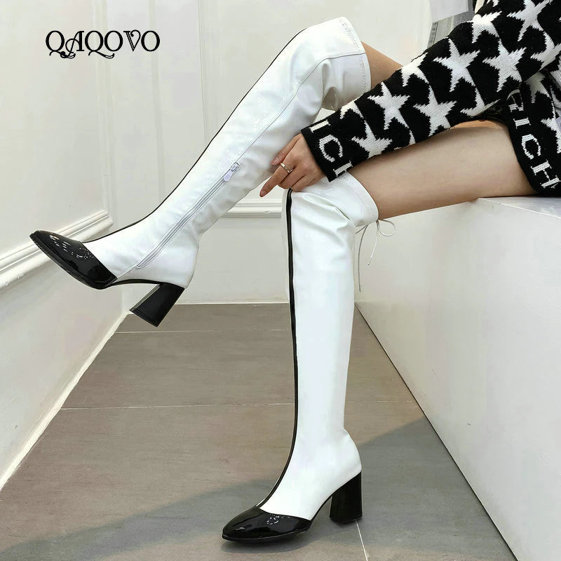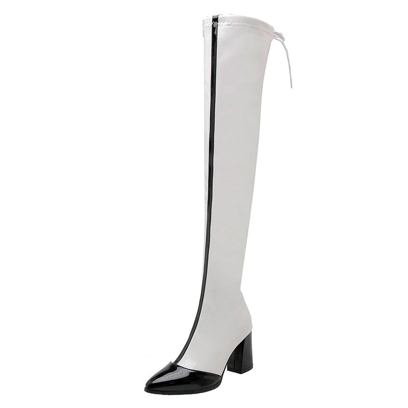 kamames Autumn Winter Women Over The Knee Boots Fashion Zipper Mixed Colors Thigh Boots Ladies Square Heel Pointed Toe Shoes Women