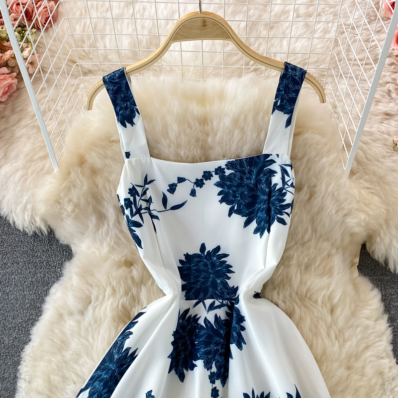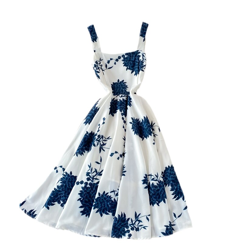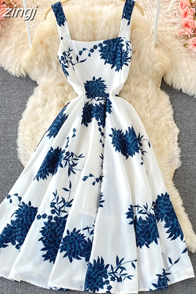 kamames Blue Floral Midi Dress For Women Elegant Square Collar Spaghetti Strap Robe Female High Waist Big Swing Vestidos 2023