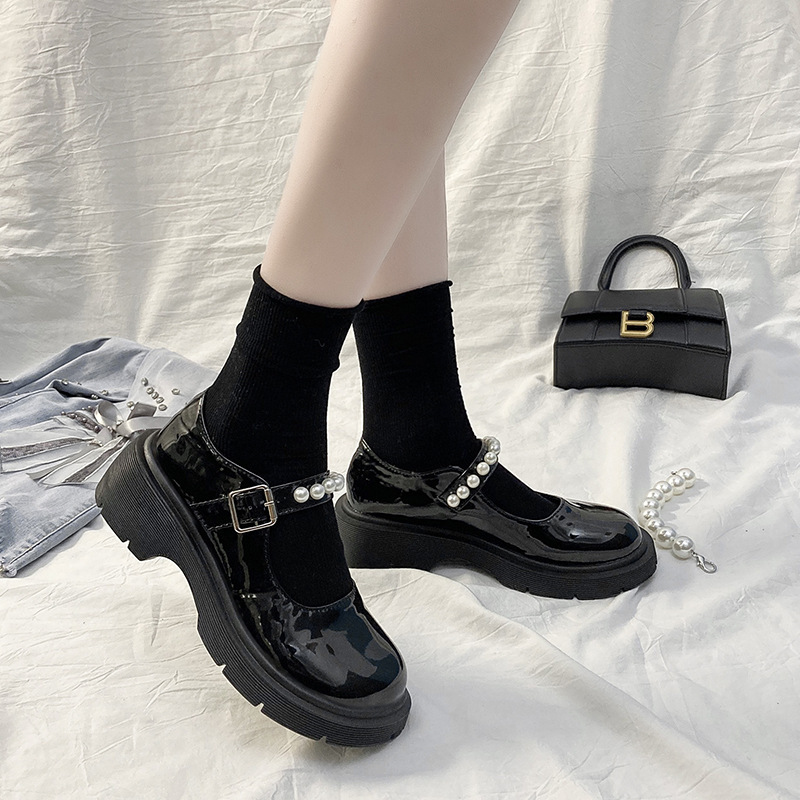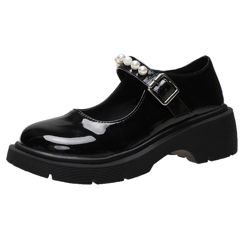 kamames Buckle Mary Jane Shoes Thick-Soled Flat-Soled Spring Single Shoes Round Head White Bright Leather Small British Leather Shoes