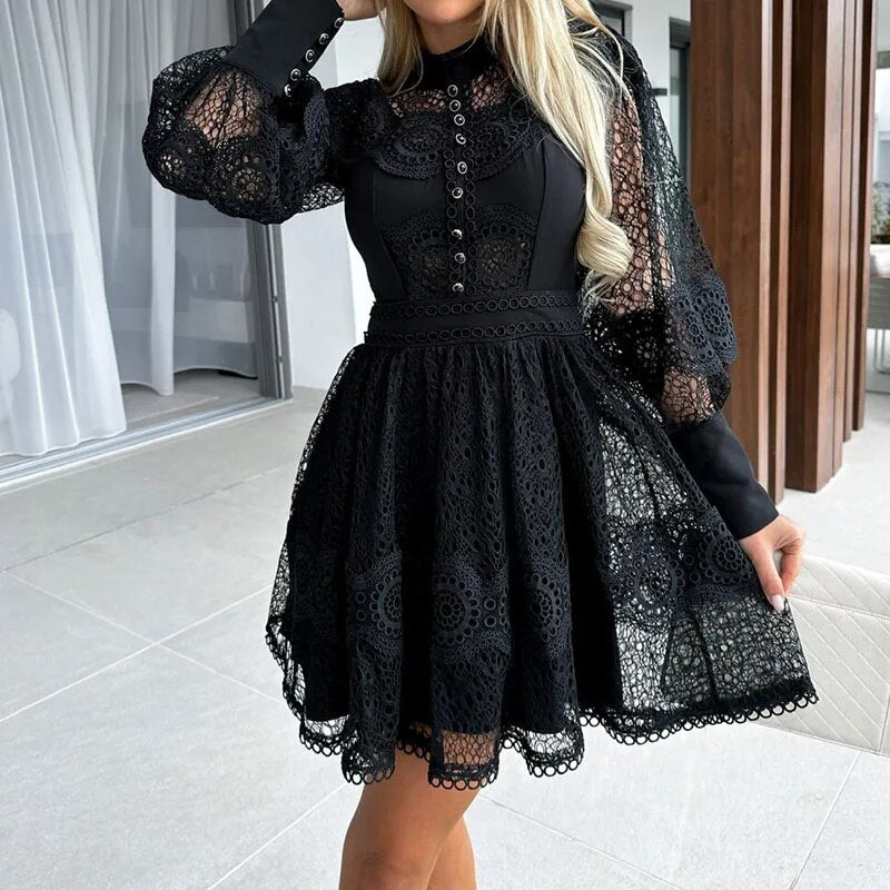 Zingj Hollow Out Long Sleeved Waist Office Dress New Spring Lace Patchwork Dress Chic Women O-neck Pearl Button Solid Mini Dress