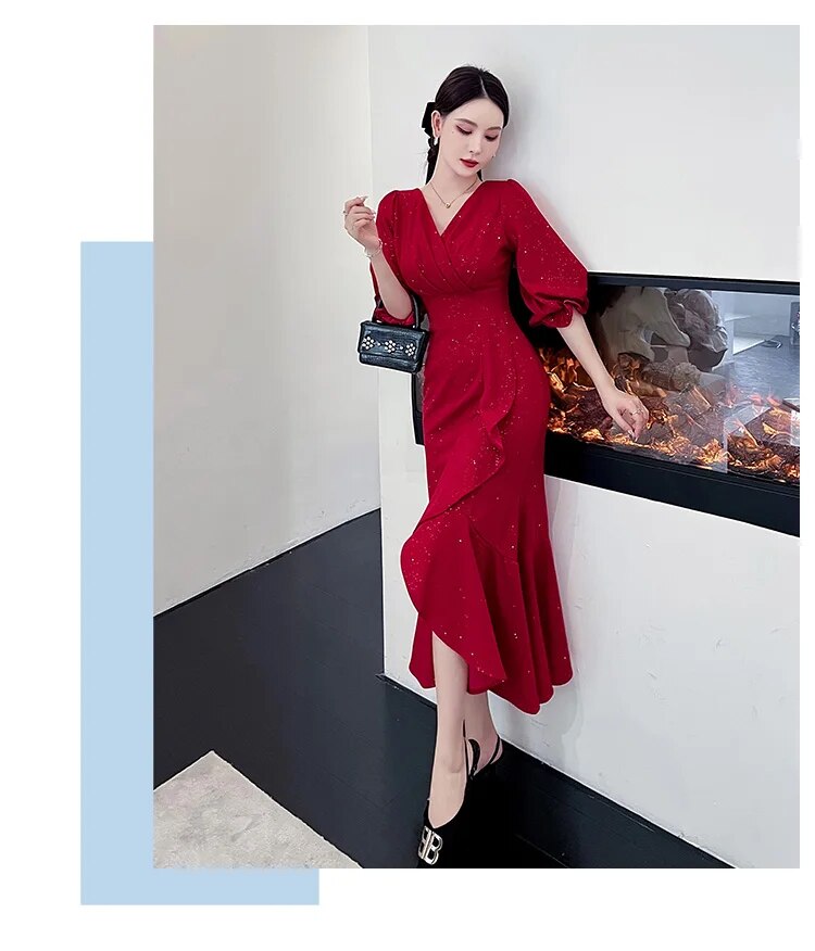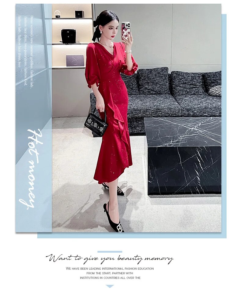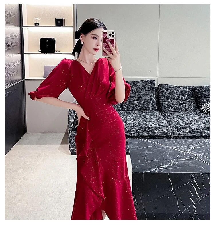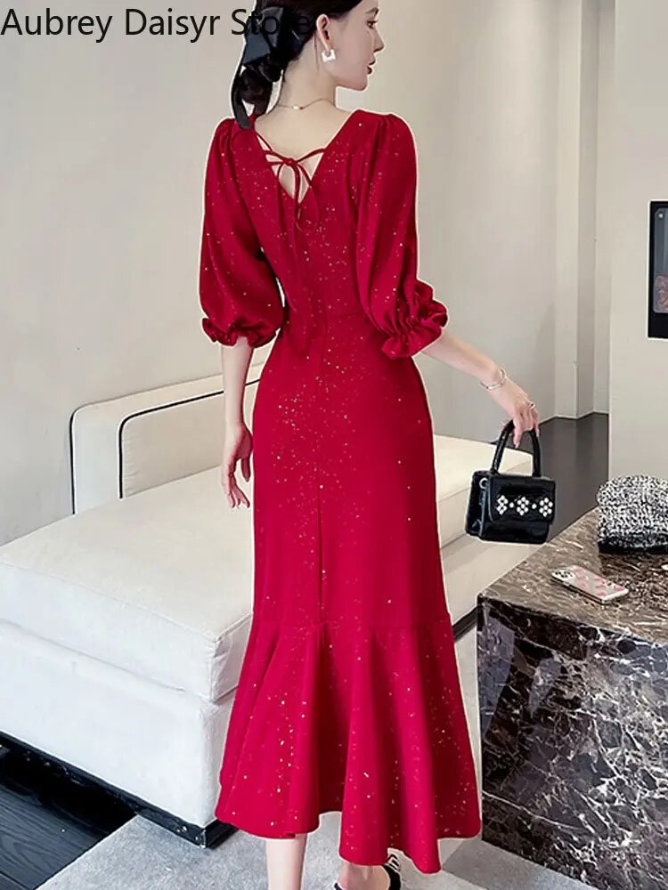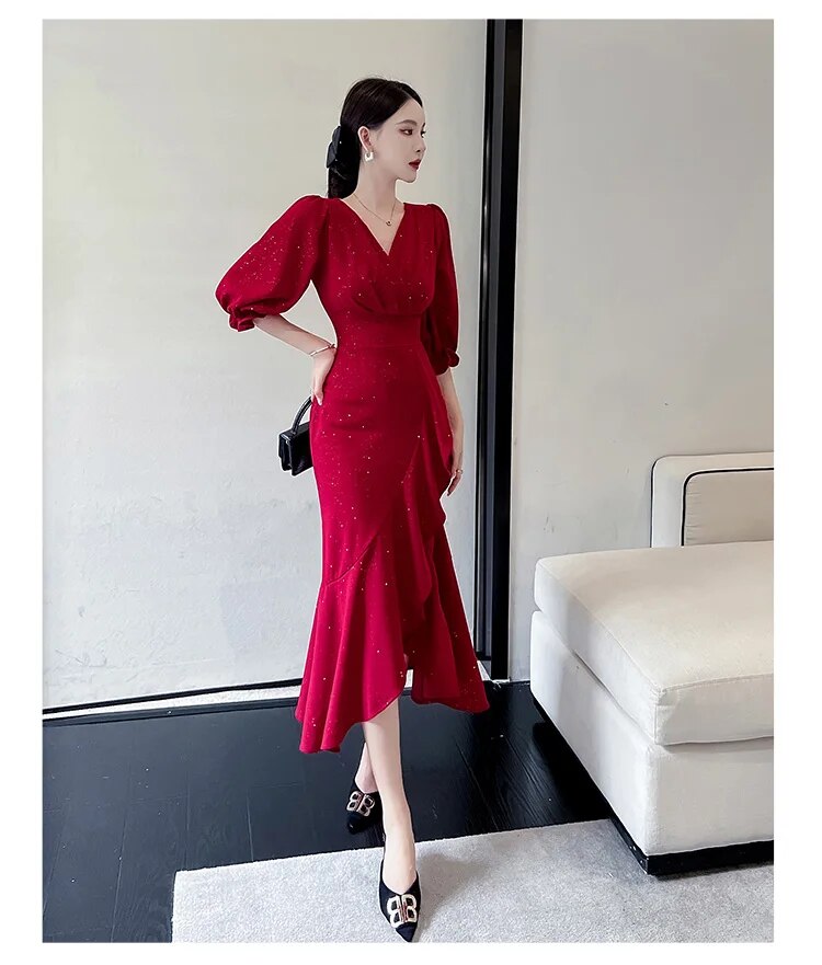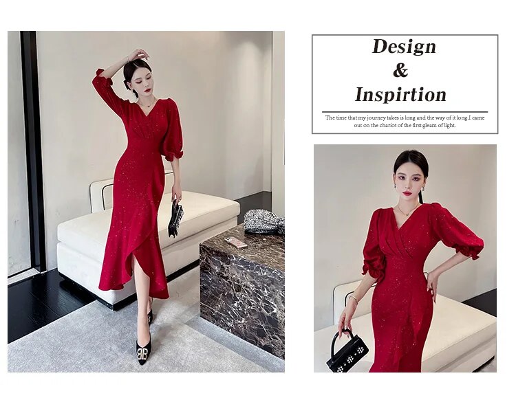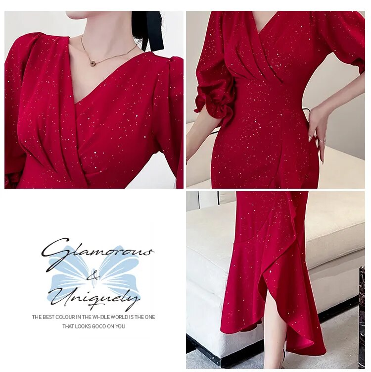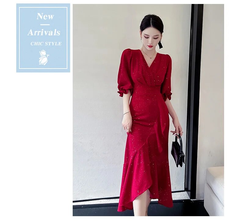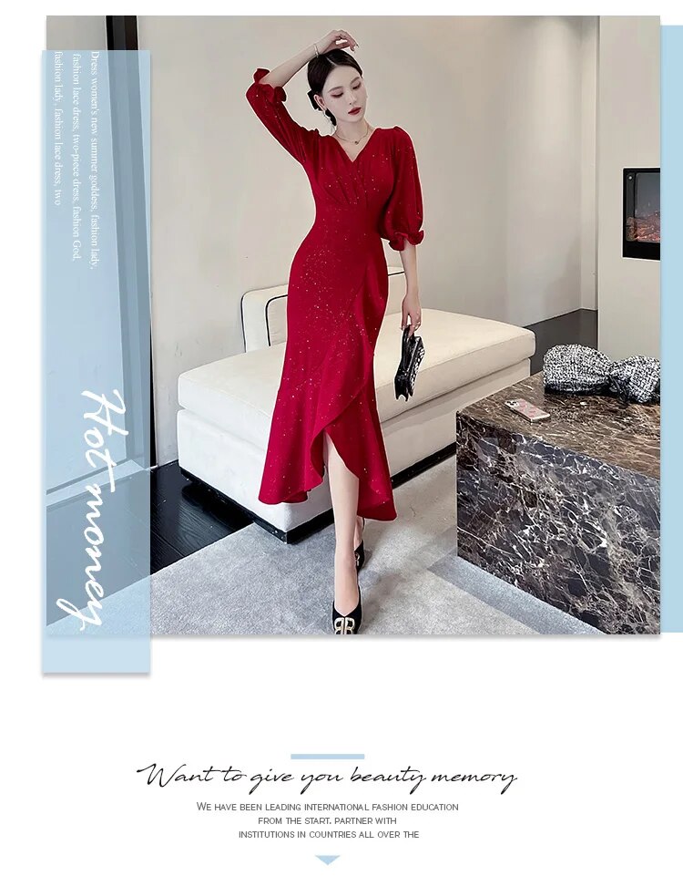 Zingj Midi Red Mermaid Dress Women Autumn Korean Sexy V-neck Irregular Sequins Dress Vintage Casual Evening Party Dress 2023