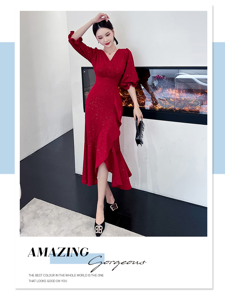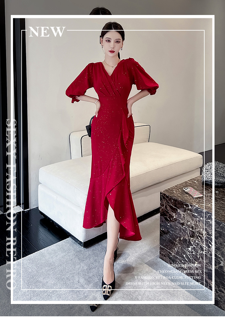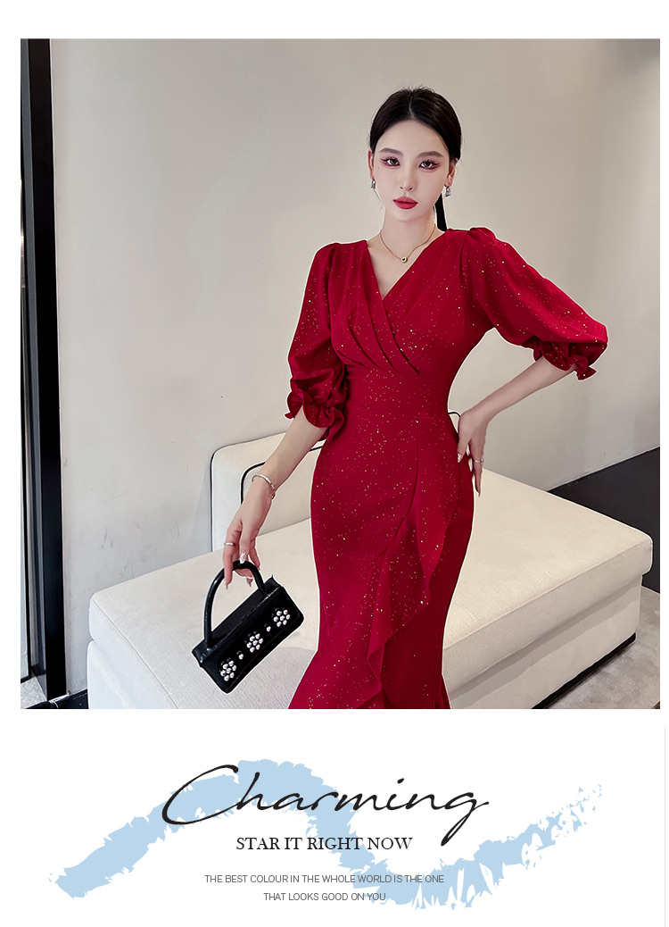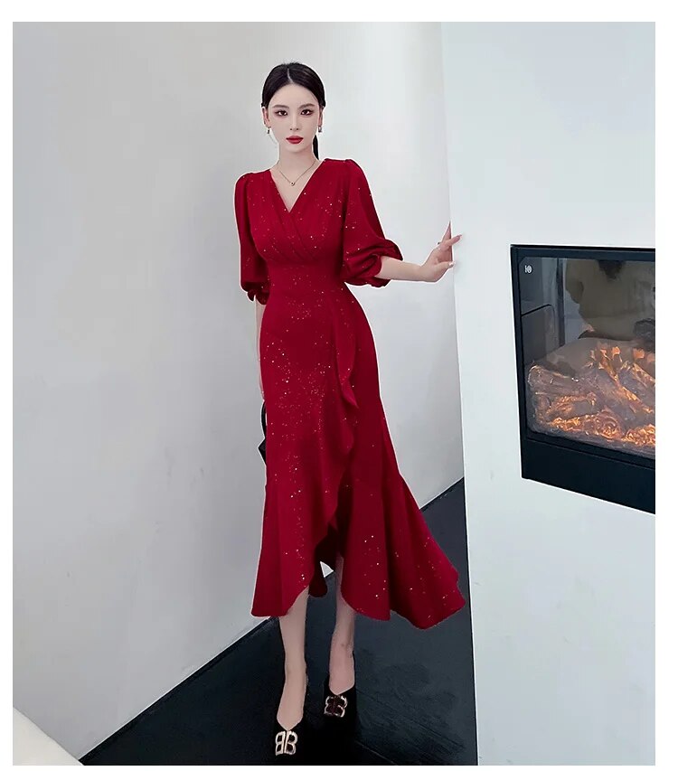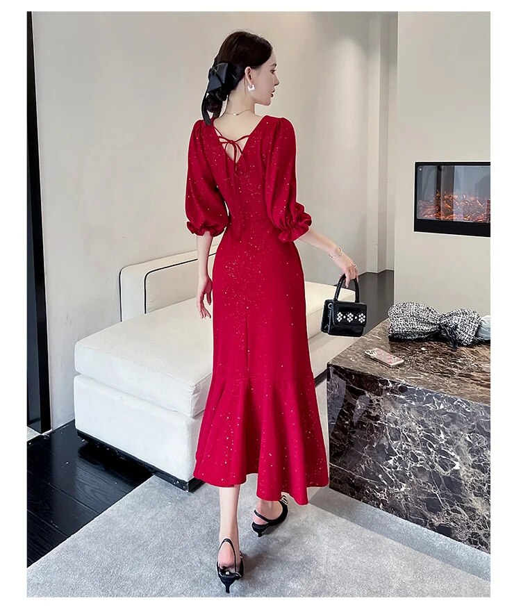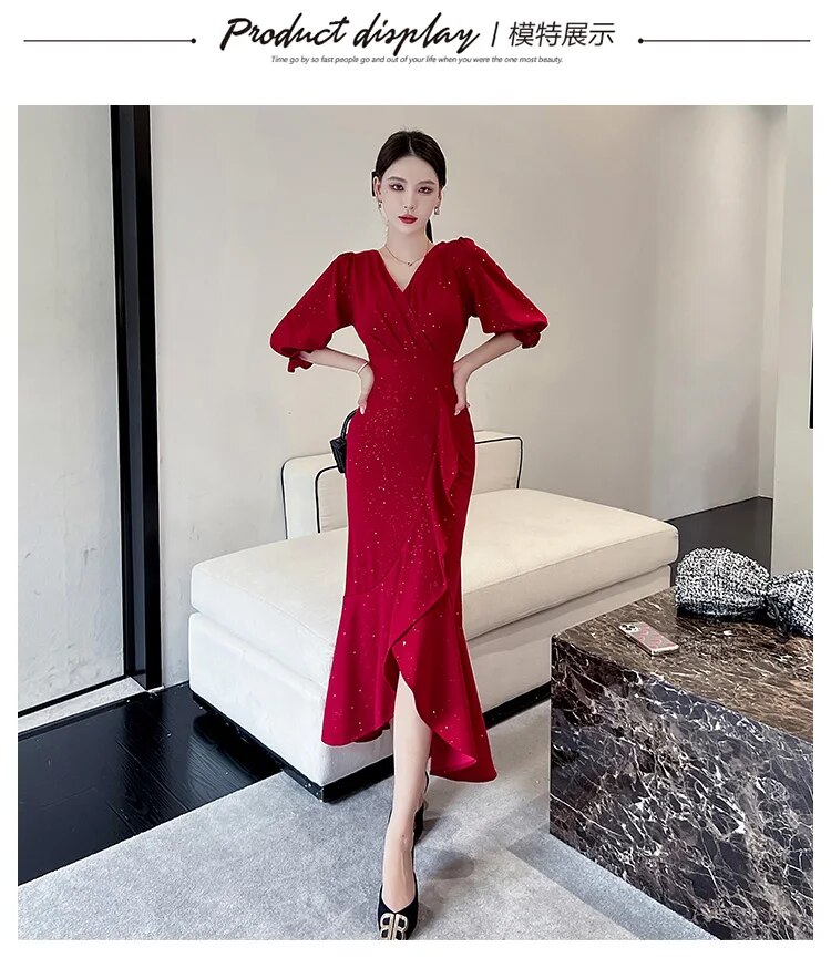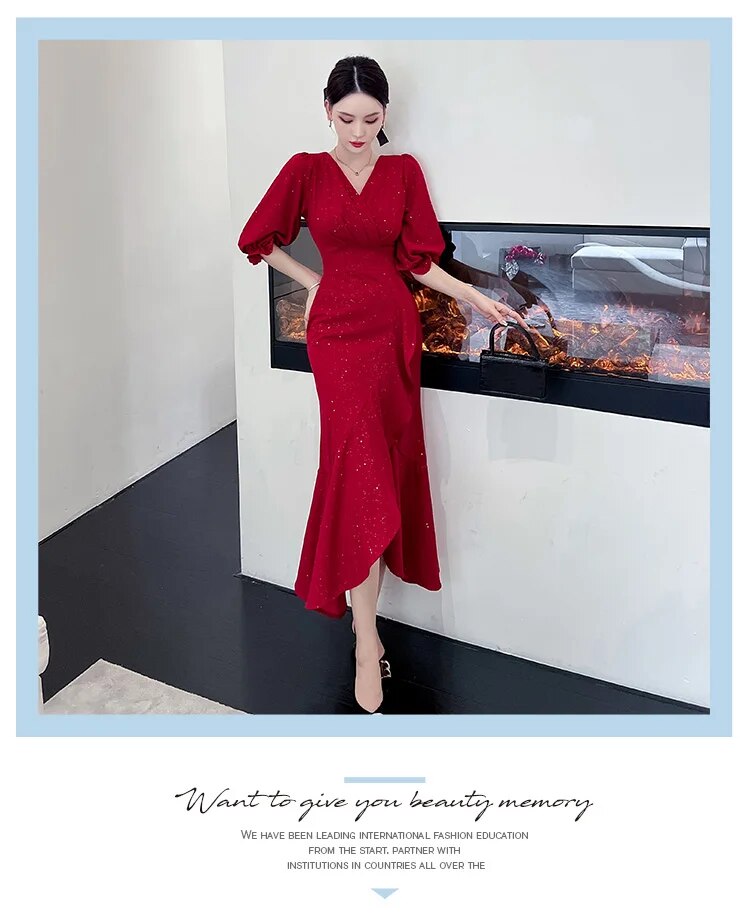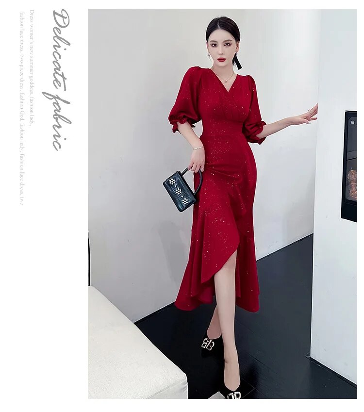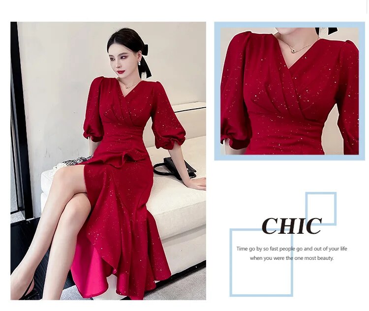 Zingj Midi Red Mermaid Dress Women Autumn Korean Sexy V-neck Irregular Sequins Dress Vintage Casual Evening Party Dress 2023