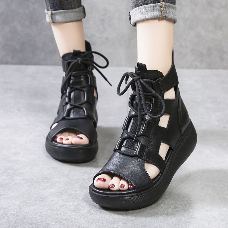 kamames New Summer Black Women Leather Sandals Cool Boots Platform Shoes Wedges Sandals Women Shoes Fashion Outdoor Sandals