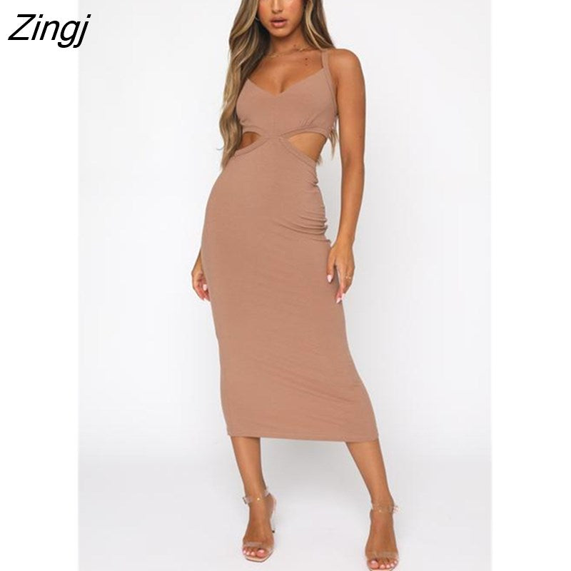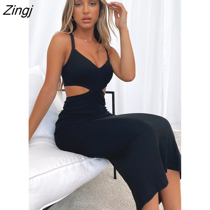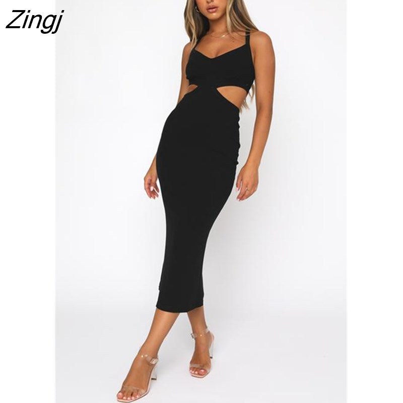 Zingj Summer Female Solid Color V-Neck Dress Sleeveless Hollow Out Package Hip Long Dress for Summer Black/Khaki/Orange/Blue