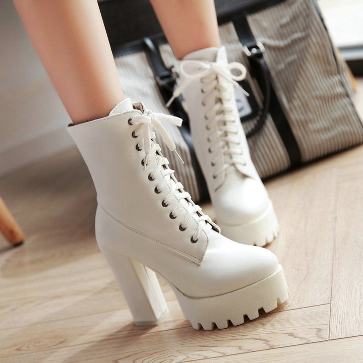 kamames Women Lacing High Heel Ankle Boots Platform Female Boots Shoes Round Toe Ladies Party Shoes Rubber Sole Promotion Black White