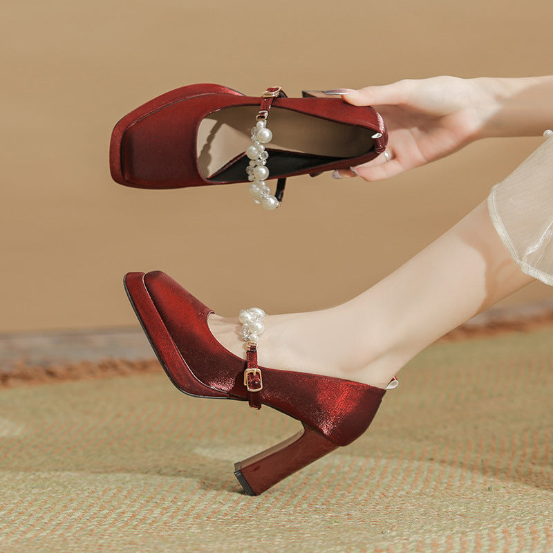 kamames kamames Square Head Thick Heel High Heels 2024 Spring French Pearl One Word Buckle Satin Wedding Shoes Bride Shoes